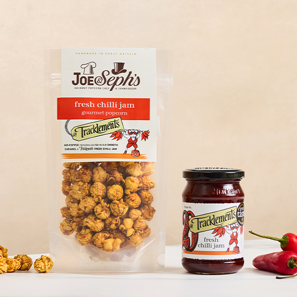 air-popped popcorn coated in smooth caramel & Tracklements Fresh Chilli Jam. A wickedly good combo of Joe & Seph’s secret caramel recipe with an impish kick from Tracklements’ addictive Fresh Chilli Jam.