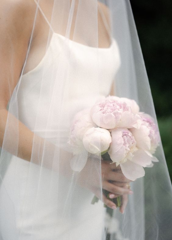 Prefer something more subtle? Peonies shine in softer palettes. Shades like blush, cream, soft peach, or pale pink work beautifully for romantic, ethereal weddings. These gentle tones pair seamlessly with ivory and white gowns, especially those with flowing fabrics or lace detailing. The key to creating a cohesive look is matching your bouquet to your overall bridal style. For example, a cascading bouquet complements a bohemian or vintage gown, while a symmetrical bouquet suits a minimalist or modern dress silhouette.