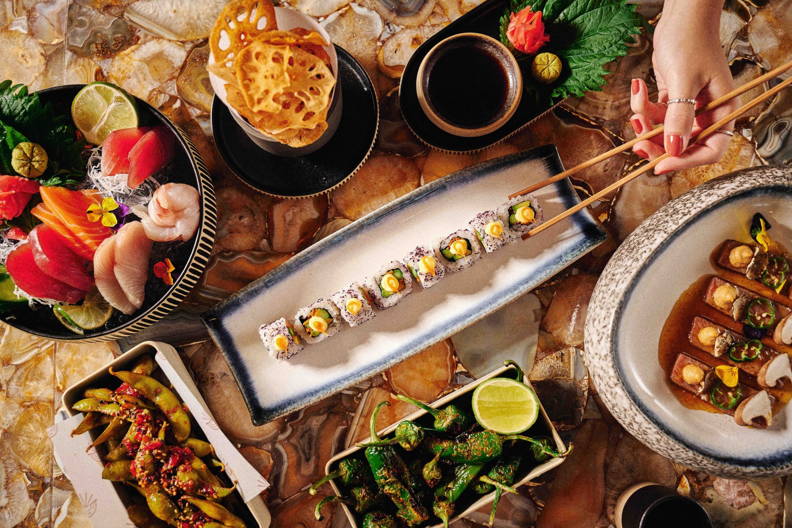 An all-day menu offers snacks, the finest sushi, seared and raw dishes, tempura style plates and a selection of Asian-inspired small plates featuring premium ingredients. Dishes include: