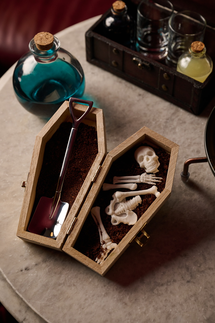 Then came the real showstoppers… the sweet treats. Each was like something straight out of a fantasy novel. The Excalibur, a white chocolate and mango cheesecake presented with dry ice, made for a dramatic entrance. The Blood Moon mousse and the adorable Witch’s Owl macaroon were almost too pretty to eat, while the playful Box of Bones… complete with chocolate soil and a tiny shovel added a fun, interactive twist.