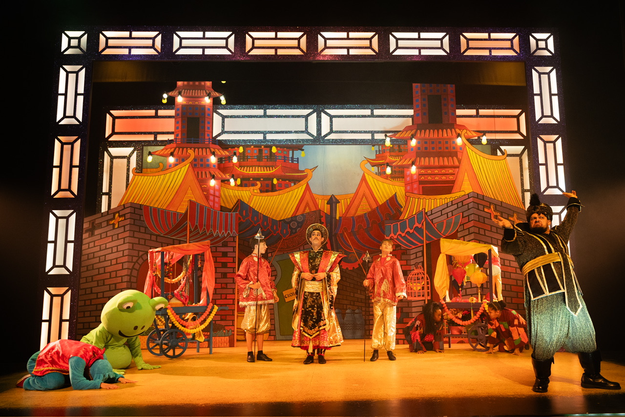 The performance follows the story of a poor young man, Aladdin, son of the widowed laundress Widow Twanky (played by the well-loved Dame Terence Frisch) who meets Princess Perfect Rose by chance and tries to disguise himself as a rich prince in the hopes of being chosen as her future husband. Of course the journey is made challenging by the hilarious baddie Abanazer who tries to trick and thwart Aladdin.