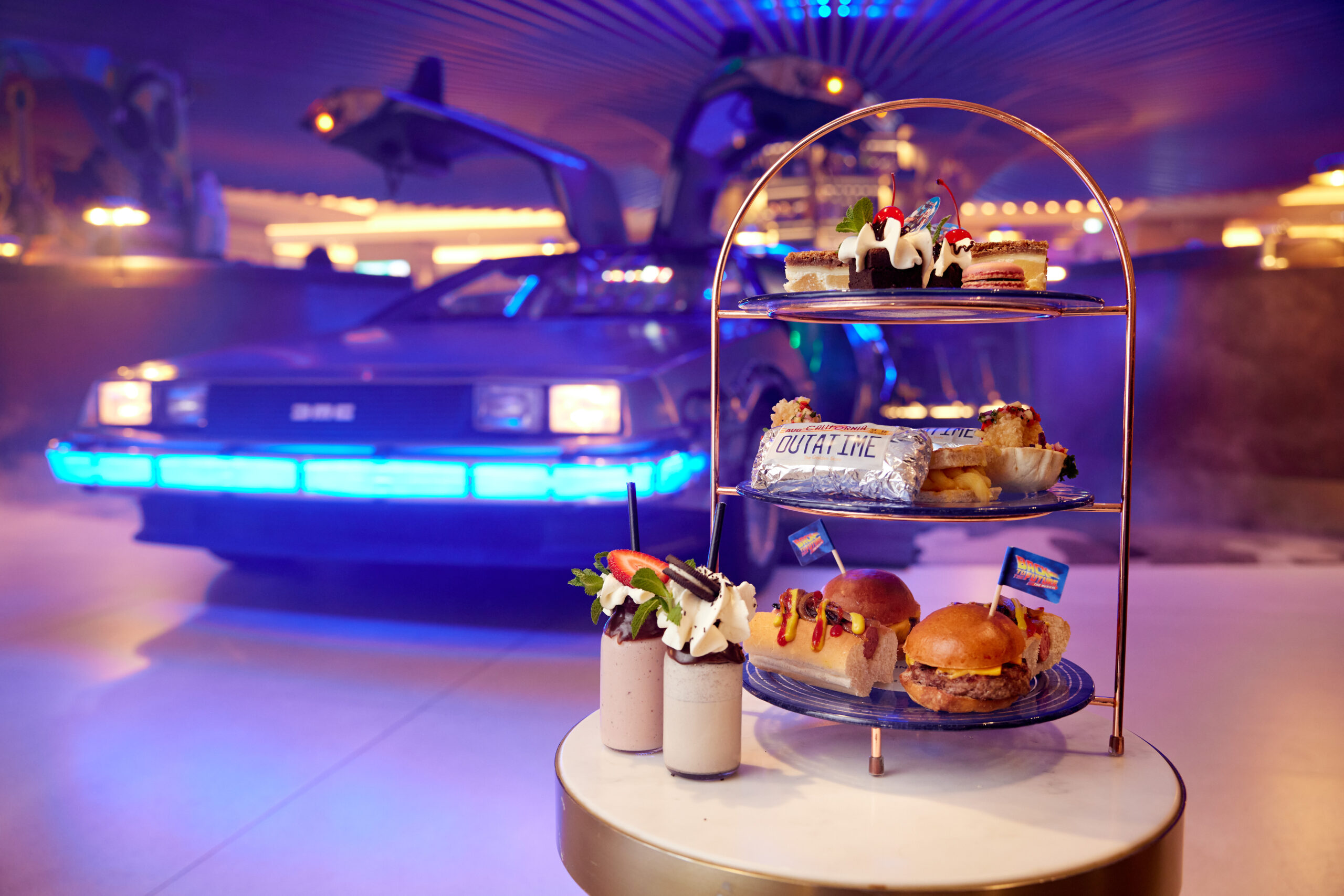 The afternoon tea will feature mini delights, designed to indulge the senses with a world of flavours. The ride begins being transported back in time to indulge in Mcfly’s slider burger and Mayor Goldie Wilson’s Hot Dog, before being grounded back in the present with the DeLorean pulled pork burritoE=MC2 Mac and cheese toastie and Marty’s crispy shrimp tortilla with slaw and spicy citrus sauce, before taking flight again into the future for Doc’s brownies, Biff’s apple cobbler and George’s fruit macaronsLorraine’s mini shake milkshakes will also accompany the tea, alongside Marvin’s berry iced tea available in refreshing flavours ranging from Raspberry and Mint to Mango and passionfruit.