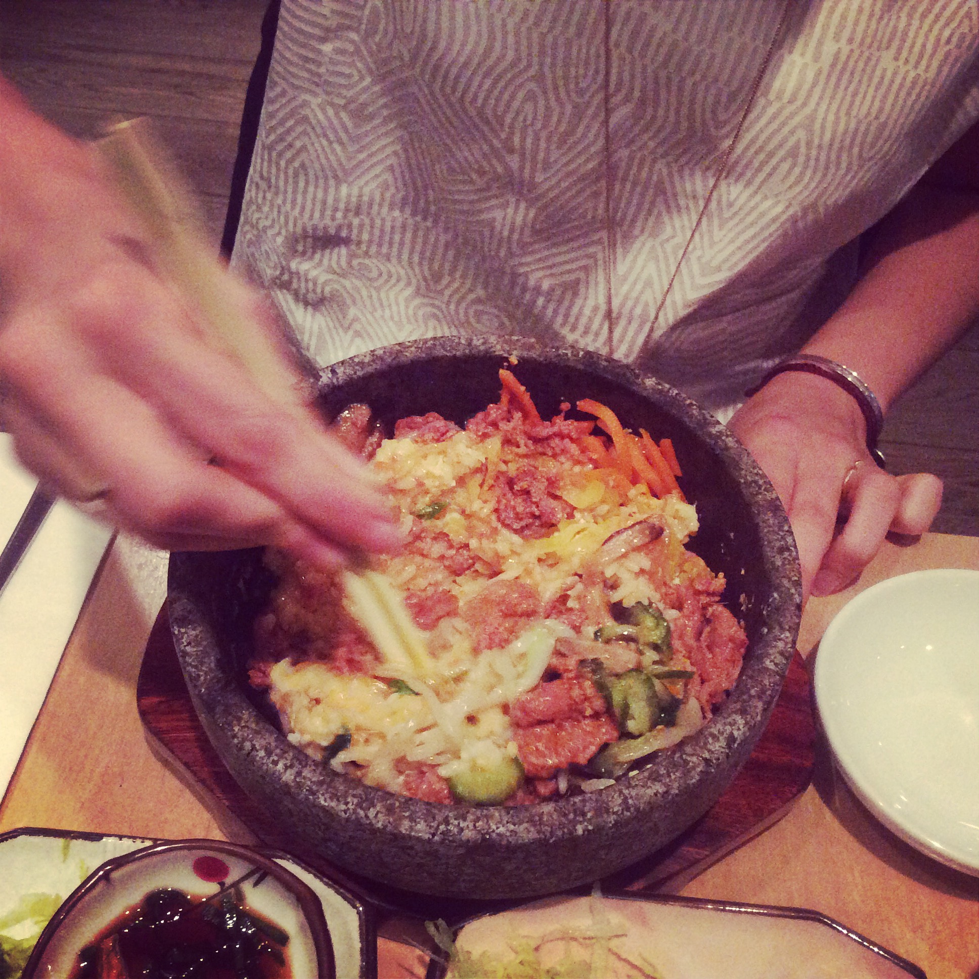 The word Bibimbap literally means ‘mixed rice’ in Korean. In Bibimbap (the restuarnat) they serve their famous main dishes in a hot bowl, so the contents continues to cook right in front of your eyes!