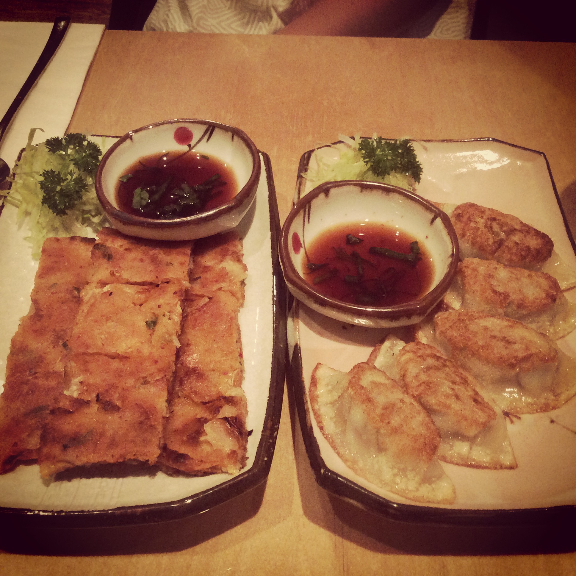 Our sides were pretty darn good too! The dumplings were filled with tender pork, which we dipped in our bowl of soy. However the surprise stand out of the evening was the kimchee pancake! It was just so flavoursome and married with the soy so well.