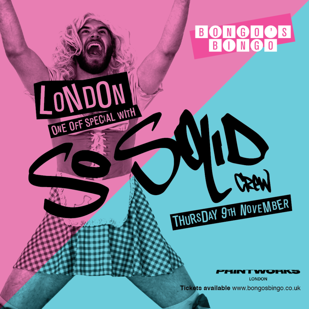 Keeping with Bongo’s Bingo’s select shows with shows guests, this eventis set to be a real classic: So Solid Crew are the famed hip-hop collective who helped to introduce their sound to the UK masses, with their fusion of garage, grime and hip-hop bringing them a number one slot with 21 Seconds as well as a BRIT Award. Expect plenty of mayhem on the stage and on the Printworks’ dance floor.