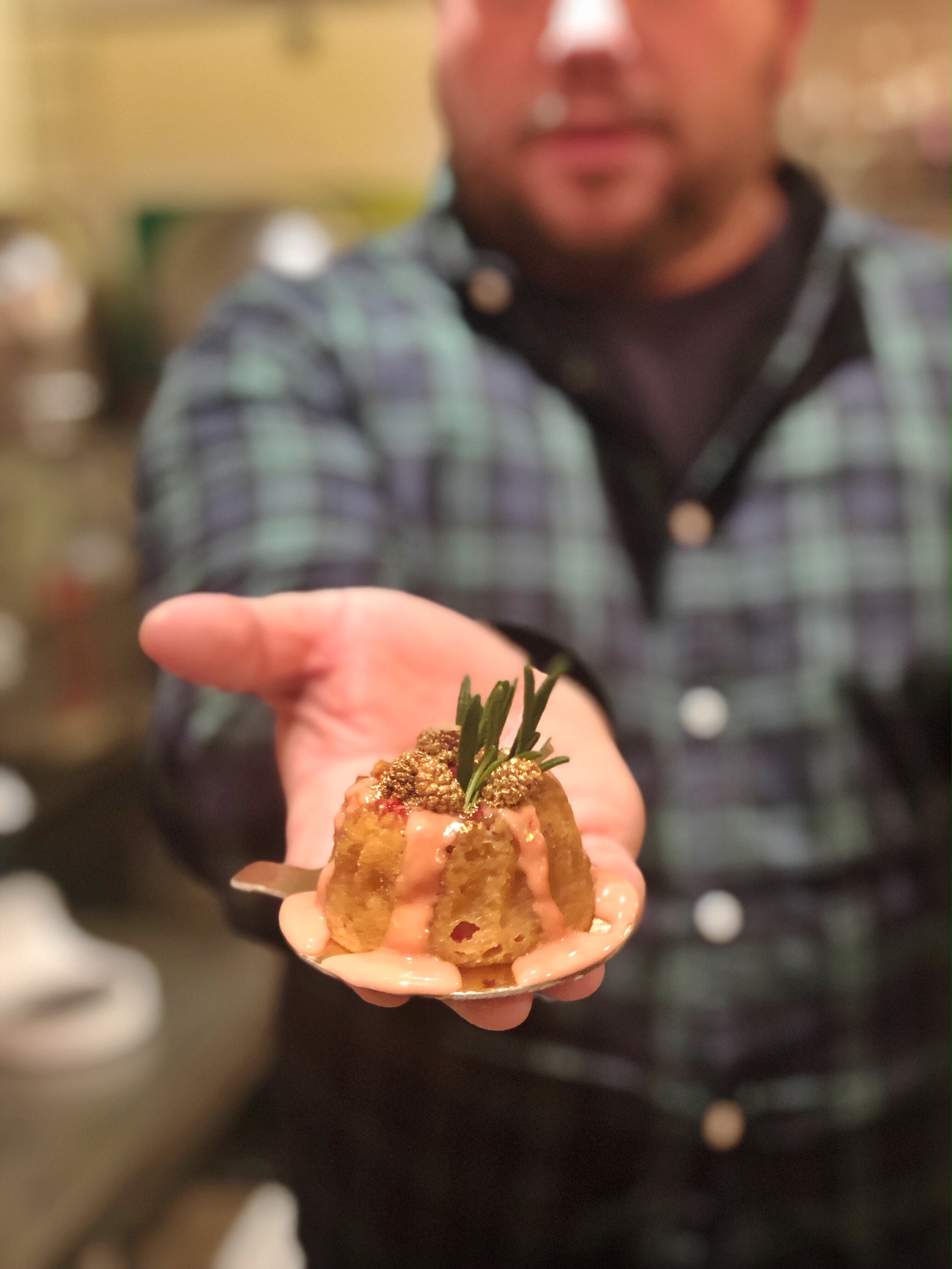 Lily then showed us how she was decorating the cakes to sell in her bakery. Her inspiration was from a Christmas wreath, so the icing was drizzled vertically on four sides. The icing is pretty sticky and does drip. You then scoop in some gin jam for the filling and top with gold-dusted mulberries and a sprig of rosemary. As it’s a versatile cake, Lily encouraged us to experiment with additional toppings and garnishes should we make the cakes at home.