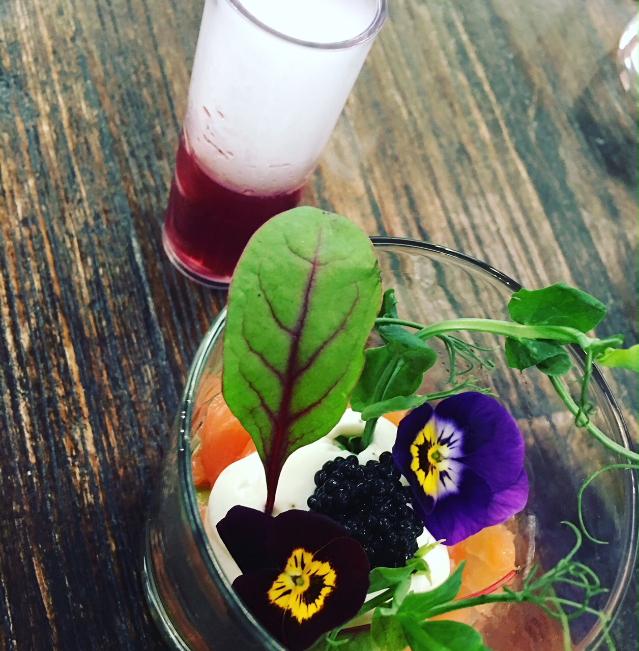 The Ham, Egg and peas (pea and spinach puree, pulled ham hock, parsnip string fries and confit egg yolk), Carrot and coriander (Carrot pulse, pumpkin seed and ginger granola, spinach and coriander puree) and Smoked salmon and avocado (lemon and pepper yoghurt, maple cured salmon, avocado puree and caviar) were our choices for the small pots. We all loved these delightful little pots which were beautifully presented with editable flowers and a Dry Ice Iced Tea. Each pot were full of flavour and were unique in texture and taste.