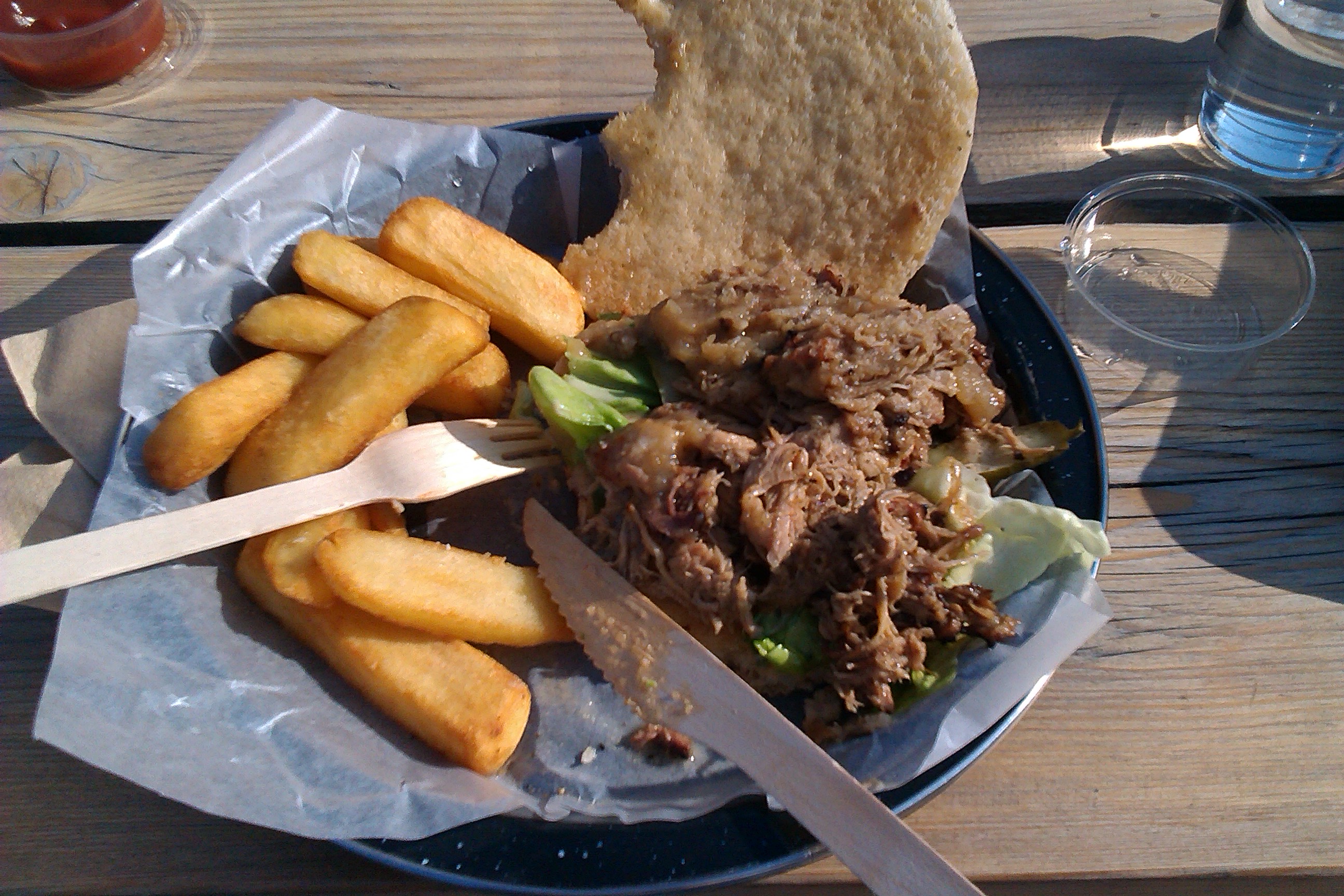 My pork was tasty, the apple slaw had a little kick to it which went down well. But the brioche bun was so so dry, it was only due to hunger (showing Papa G the sights all day!) and the quite interesting tangy ketchup that it ended up in my tum. Plus my pickes were rather tough, which makes eating with a wooden fork a tad difficult. Dads burger was a good meaty burger (he actually said ‘better than Burger King’) but not a speck on the joint I took him last time (@MEATLiquor). However we both agreed the 3x cooked chips were awesome, I like them chunky beasties.