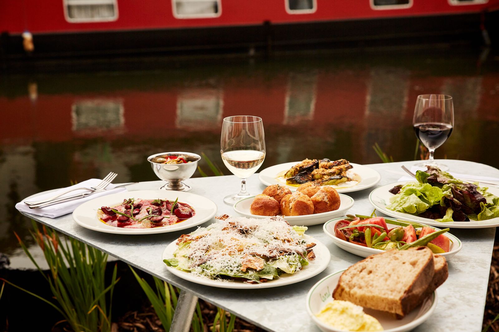 From the moment we walked into Canal, right on the edge of the Grand Union Canal in Westbourne Park, it felt like we’d found a little secret – that had be splashed all over TikTok and Hot Dinners. The light spilling in from the water outside gave the whole room a gentle glow, and the mix of raw concrete, zinc surfaces and warm wooden touches struck that rare balance between stylish and welcoming. We were seated near the terrace – close enough to catch the view without having to put suncream on and it felt like our own private corner, even though the restaurant was buzzing.