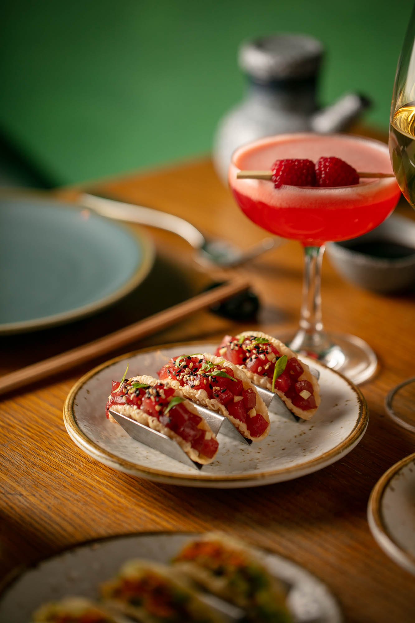 (Cooked salmon, cream cheese, spicy mayo fried in panko butter and tare sauce), the Fish Croquettes, the Beef Bao Buns and both the Salmon and the Pork Tacos. You won’t go wrong if you order these.