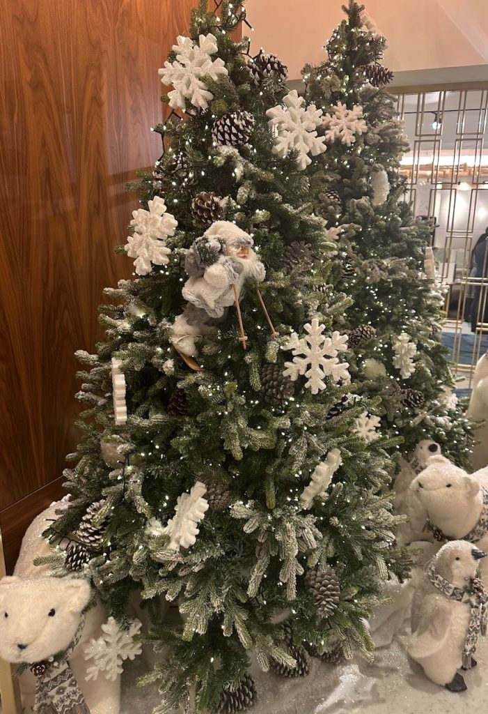 Guests arriving at the grand lobby were greeted by a towering Christmas tree dressed in red and gold. Later arrivals stepped into a flurry of snow, courtesy of a snow machine showering them as they entered. Santa himself was on hand to spread cheer – and yes, I couldn’t resist getting a photo with him. There was also a red sleigh with reindeer and a series of themed trees. One Christmas tree near the staircase captured a winter wonderland scene, complete with snowflakes, a skiing Santa, and polar bears and penguins.