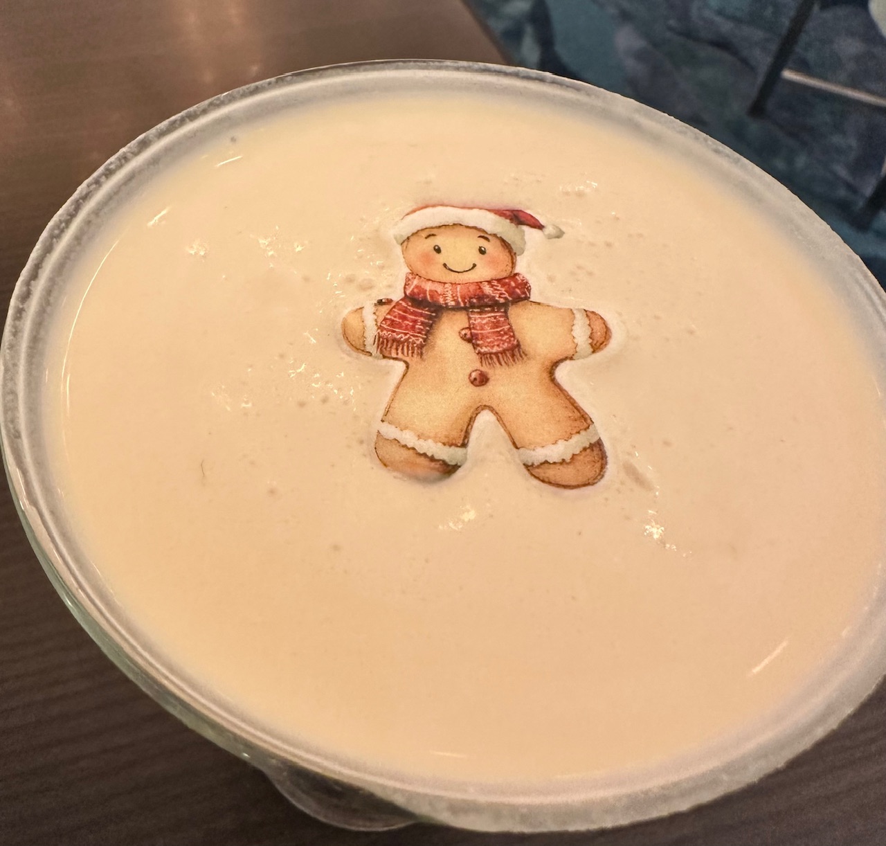 • Gingerbread Martini – Vodka, Bailey’s, gingerbread syrup, cream, and supasawa, topped with an edible gingerbread man. Creamy, indulgent, and almost too pretty to sip.