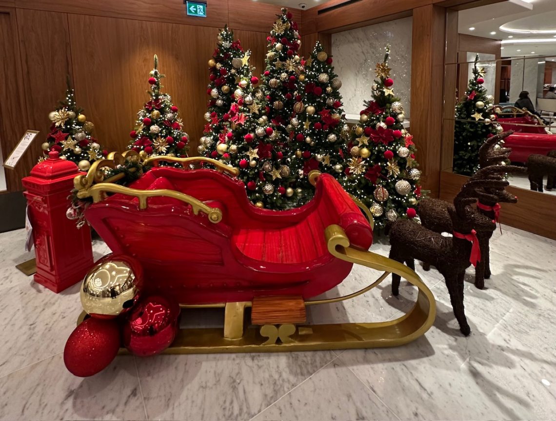 Guests arriving at the grand lobby were greeted by a towering Christmas tree dressed in red and gold. Later arrivals stepped into a flurry of snow, courtesy of a snow machine showering them as they entered. Santa himself was on hand to spread cheer – and yes, I couldn’t resist getting a photo with him. There was also a red sleigh with reindeer and a series of themed trees. One Christmas tree near the staircase captured a winter wonderland scene, complete with snowflakes, a skiing Santa, and polar bears and penguins.