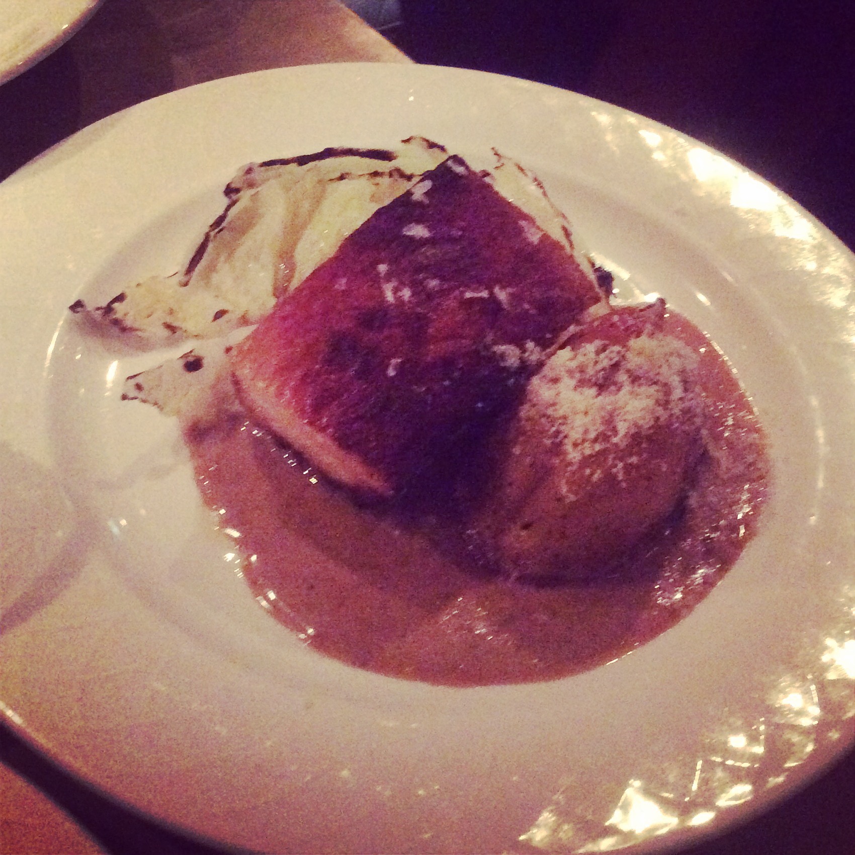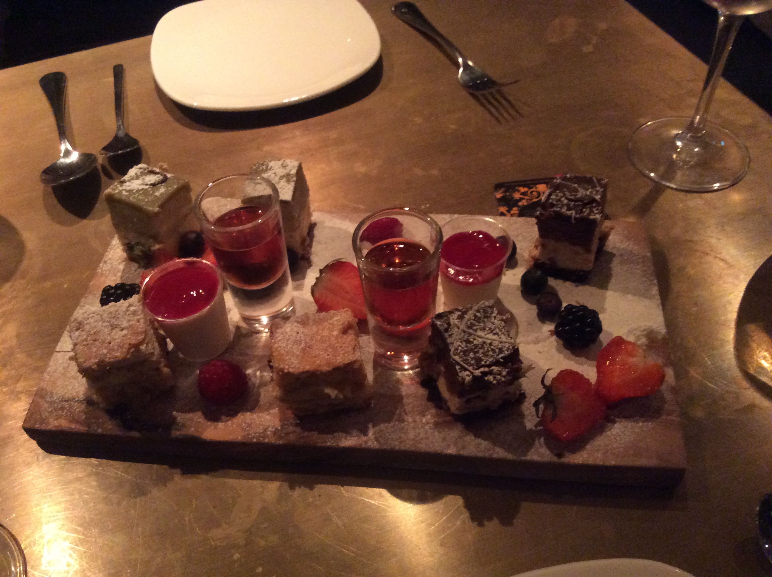 Goodness it was delicious. Each flavour was completely different, and I took joy in taking bites of each in turn. The nutty pistachio, the chocolate cake laced with hazelnut and the layered pastry of the sweet mille feuille. The tangy raspberry sauce complimented the creamy panda cotta. We culminated our meal with a cheeky sharp swig of masala wine.