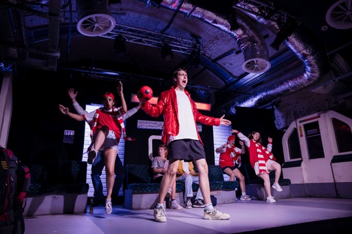 Even before the performance, we’re made to feel as if we’ve entered the underground. A man in high vis with a megaphone tells us of delays on the service, there’s a busker, and a whiteboard with a quote of the day. Original songs were by Richard Longdon and Tom Woffendeb with Jay Foreman’s ‘Every Tube Station’ song making an appearance. Don’t worry, it stops before it reaches the nearly 300 stations. It is interesting to listen out for your stations as it plays whilst exiting the theatre.