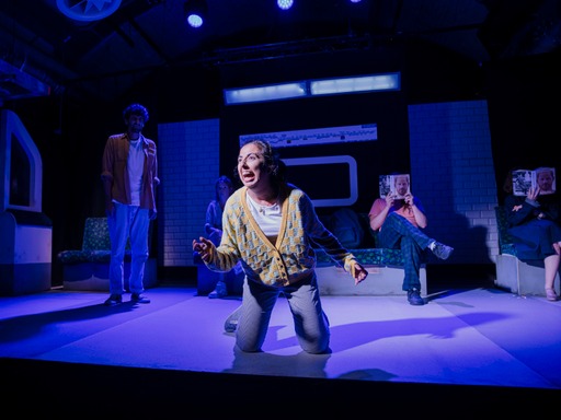 ‘Cockfosters’ was written and produced by Tom Woffenden and Hamish Clayton. Clayton as the director keeps the 60minute play moving pretty briskly from scene to scene, with characters only staying for a stop or two, and tube announcements being a way to end a scene. Gareth Rowentree’s design is recognisable immediately as a tube carriage with the blue patterned seats strewn with newspapers.