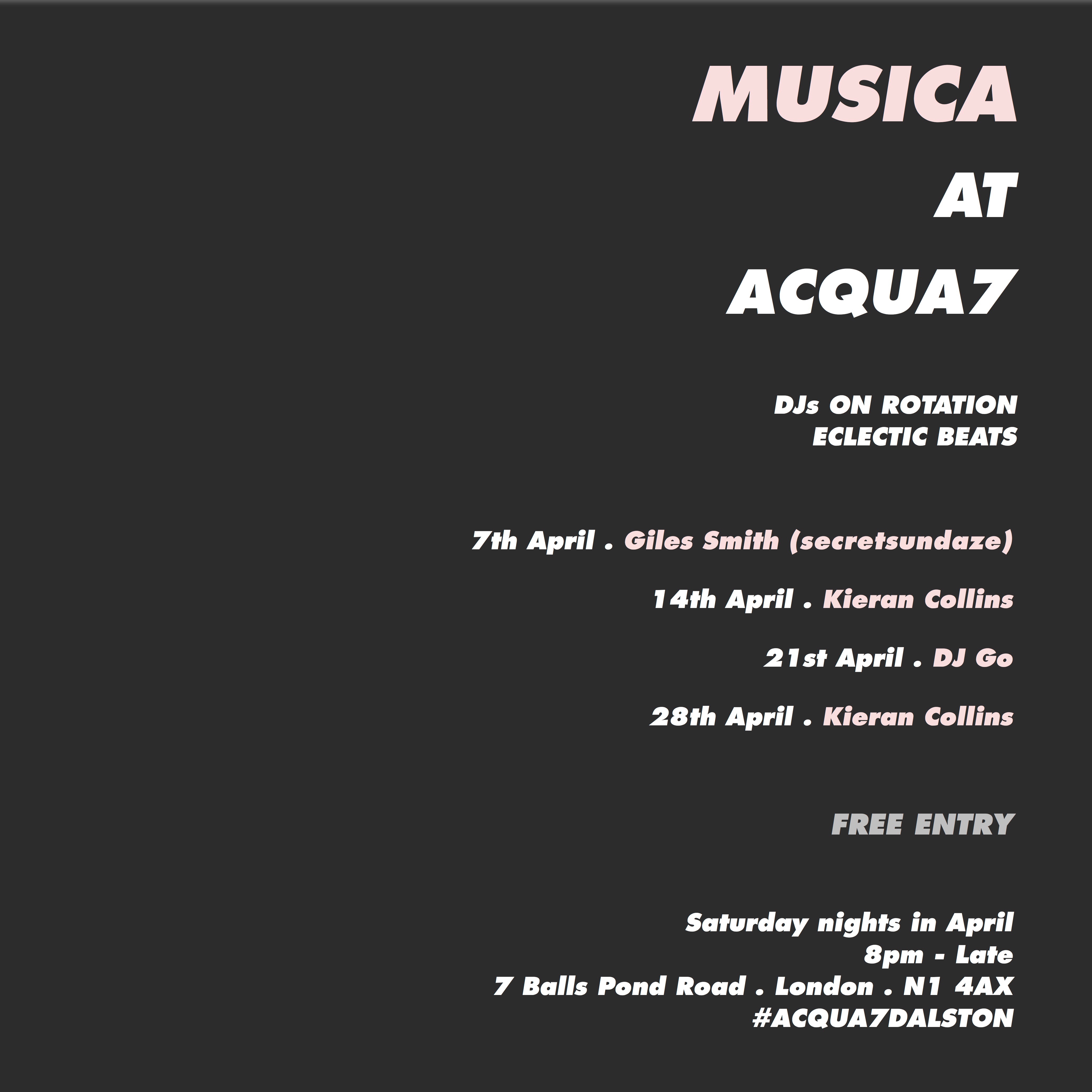 Acqua7 in Dalston are introducing Musica – a brand new series of Saturday evening DJ nights throughout April. Welcoming Giles Smith, the co-founder of Secretsundaze – one of Europe’s most distinct voice in underground electronic music on the 7th April. Giles will play an eclectic blend of soul, jazz, funk and house.