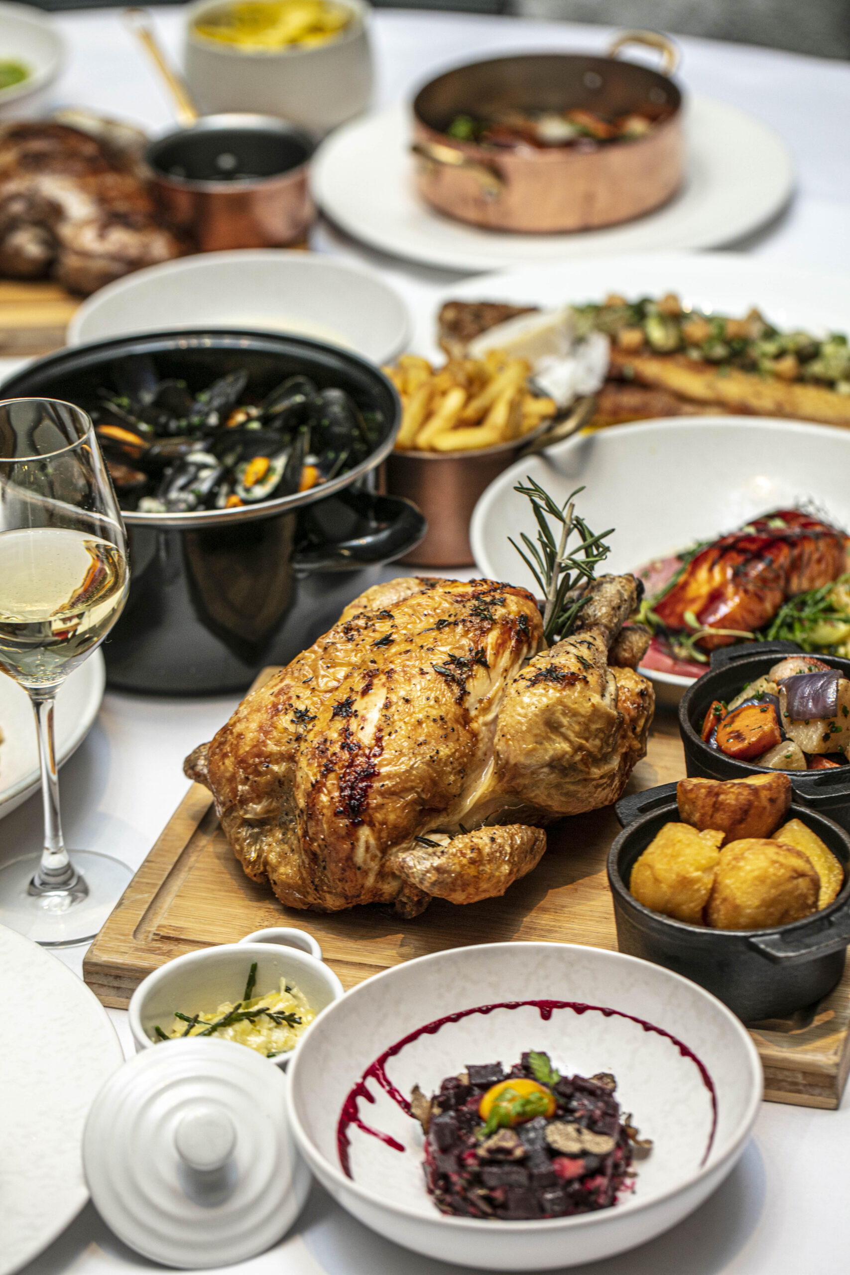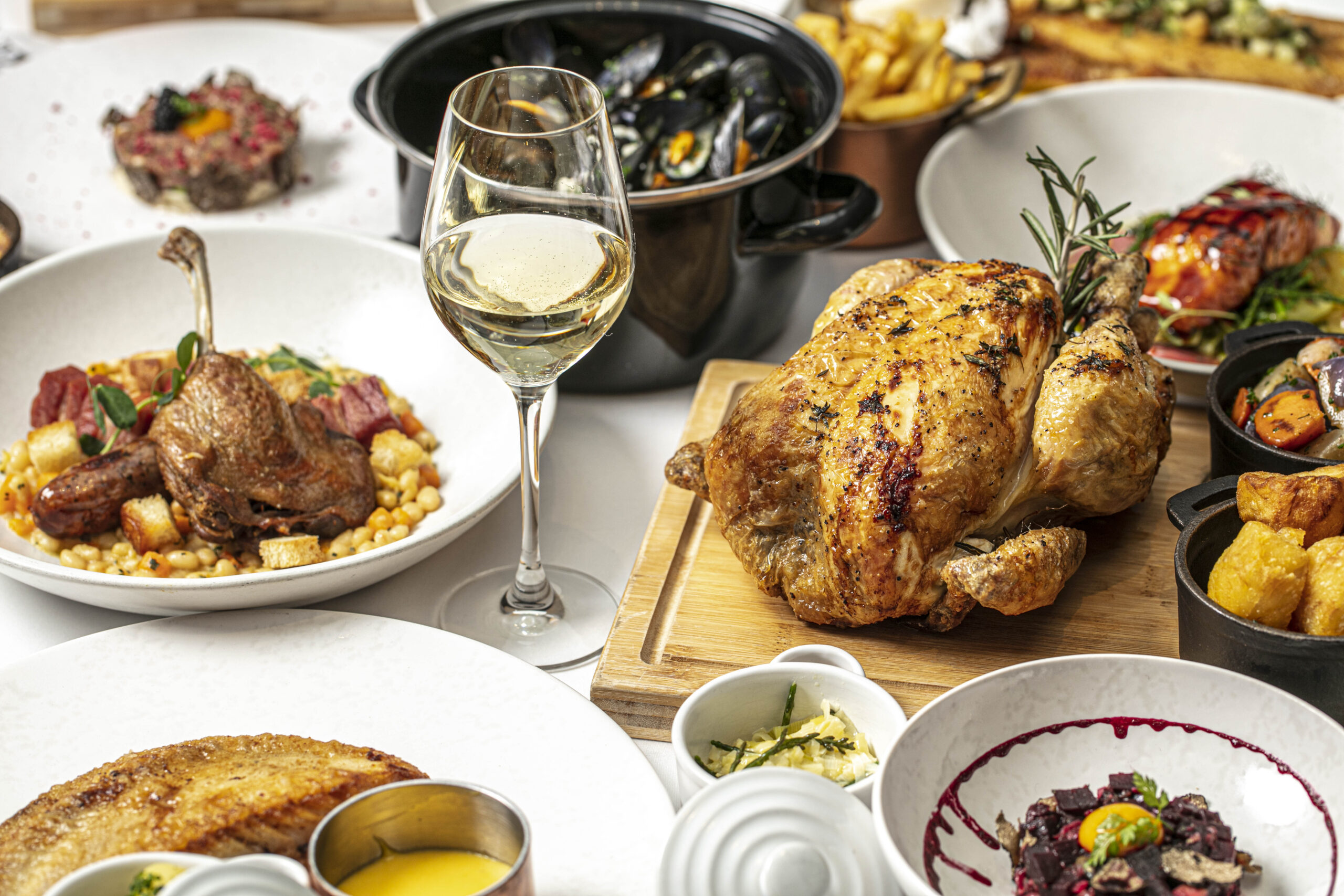 Les Rotisseries sits alongside additional mains, including Loup de mer – seared fillet of sea bass, Devon white crab and prawn risotto with American sauce; Souris d’agneau – rosemary and garlic slow cooked lamb shank, pomme puree and spring onions or for those looking for an extra treat, a Chateaubriand to share with pommes frites.