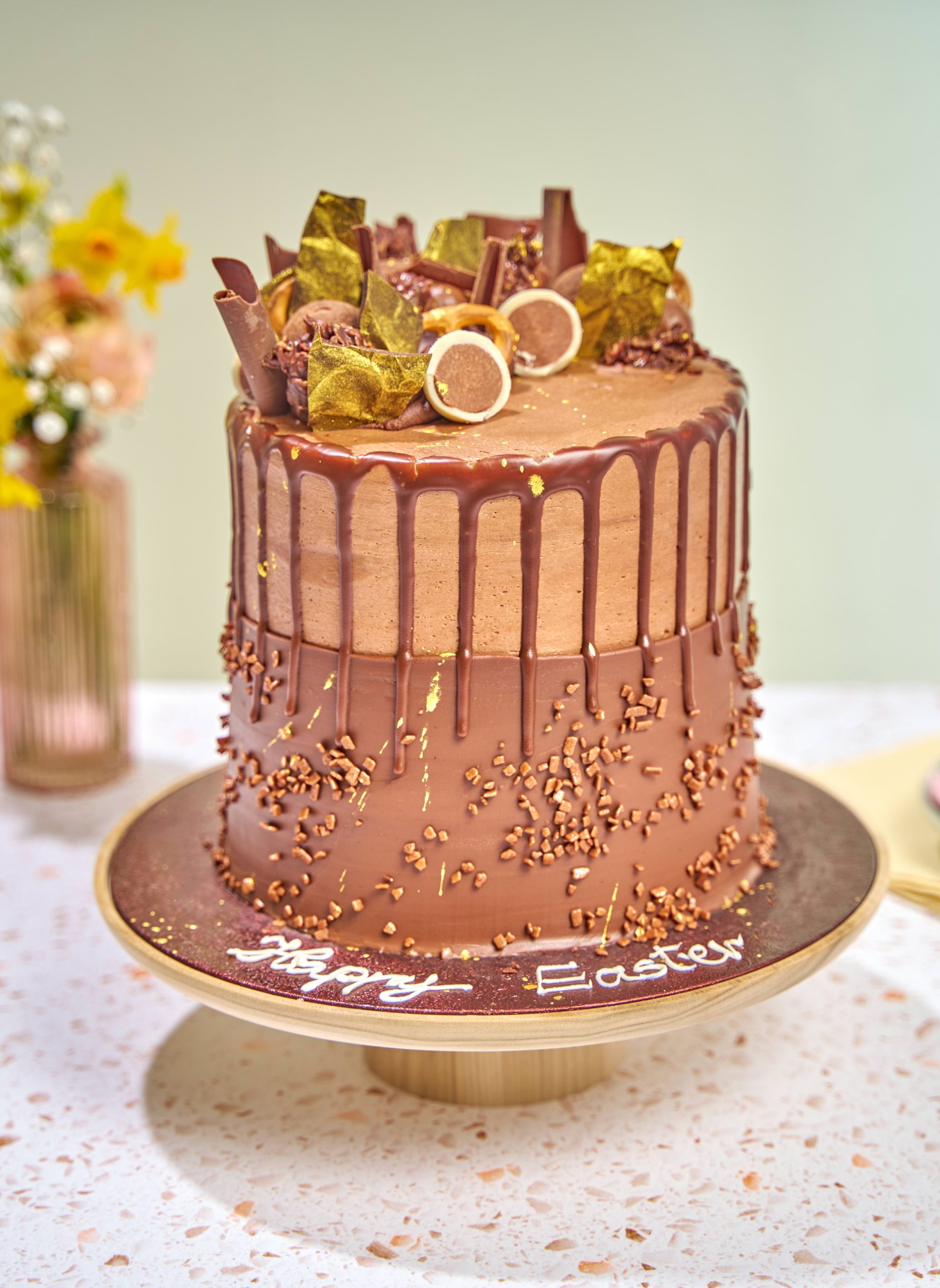 The ultimate Easter chocolate indulgence and the perfect centrepiece! A rich chocolate cake filled with velvety chocolate mascarpone, topped with silky buttercream and glossy ganache. Decorated with a decadent mix of chocolate bricks, crunchy rocks, pretzels, truffles and Maltesers, finished with a sprinkle of golden dust.