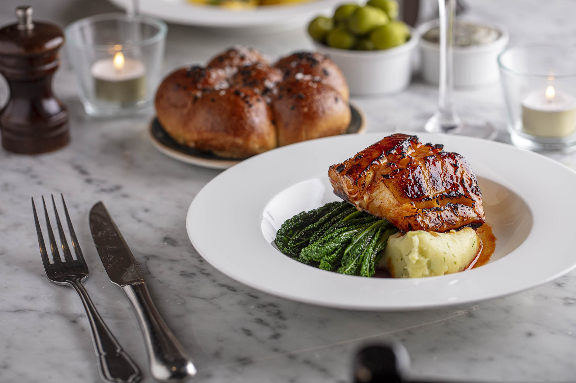 Secondo: Honey and ‘nduja glazed cod, cavolo nero, olive oil and herbs mash potato