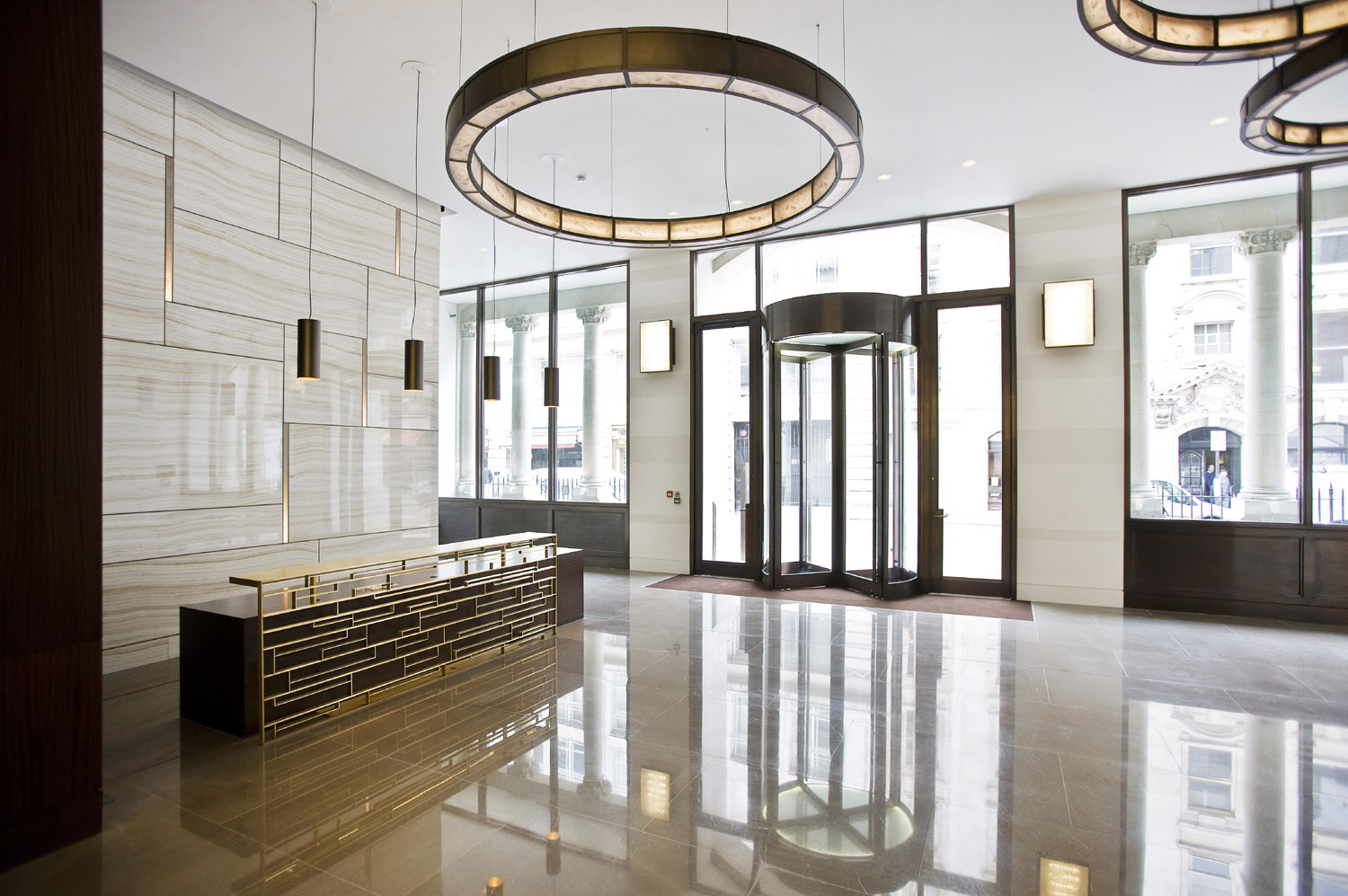 Recently completed reception area in Wimpole Street fulfils all criteria for a prestigious but welcoming space, opulence without ostentation, meticulous attention to detail, from light fittings to lift doors.