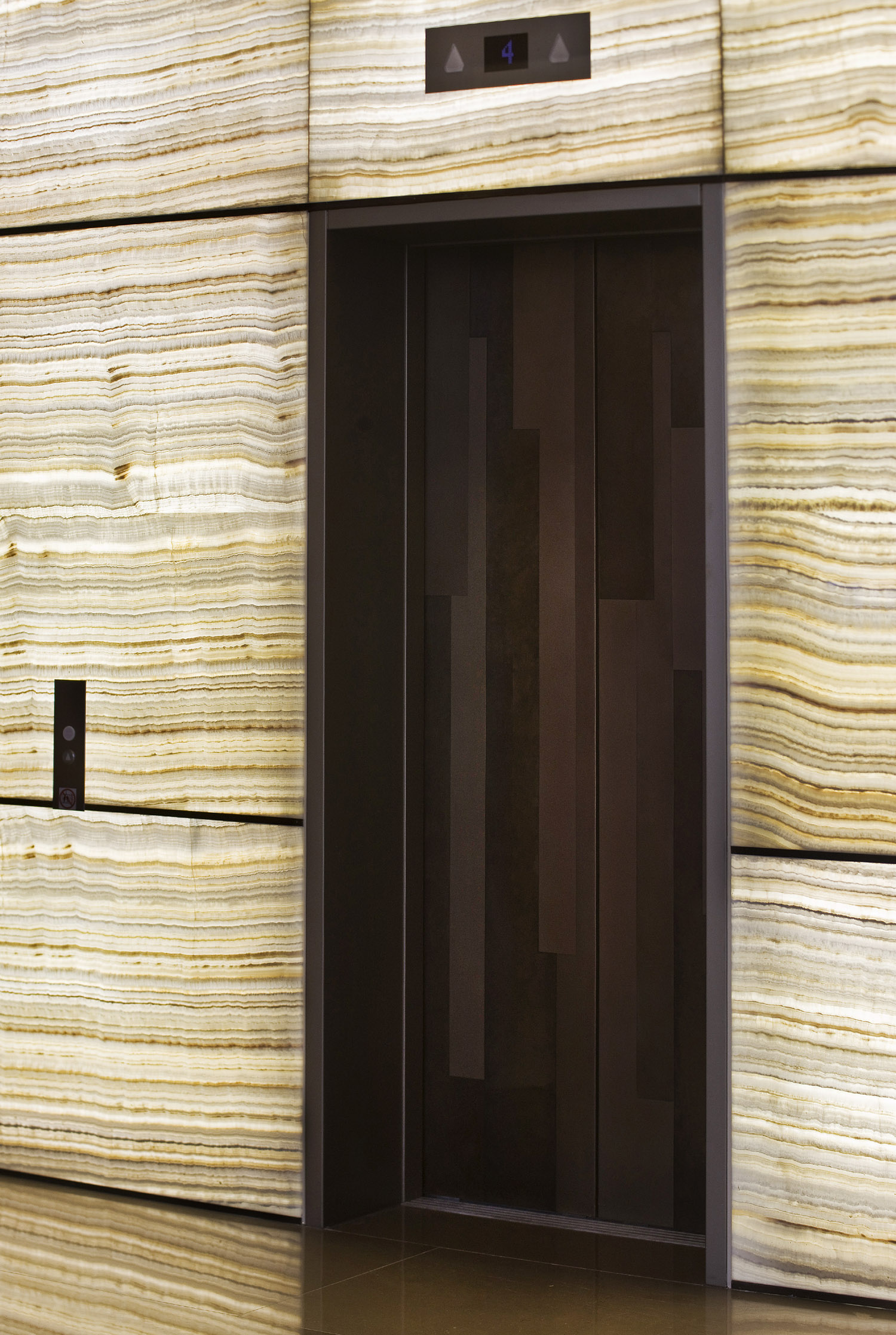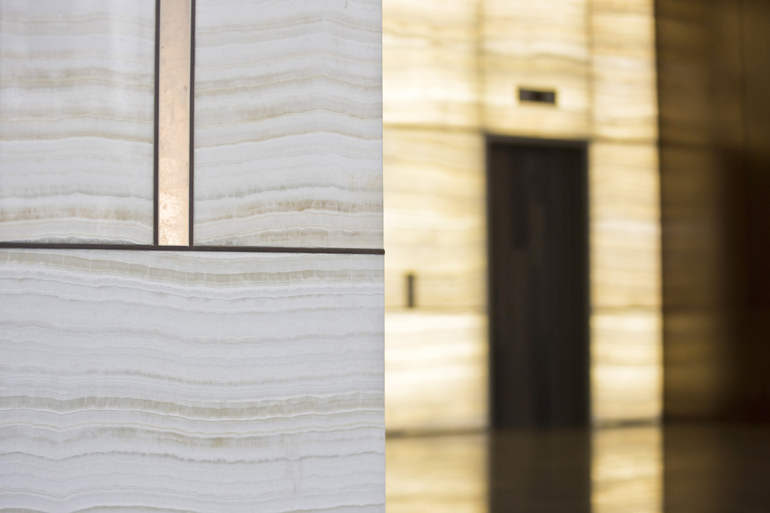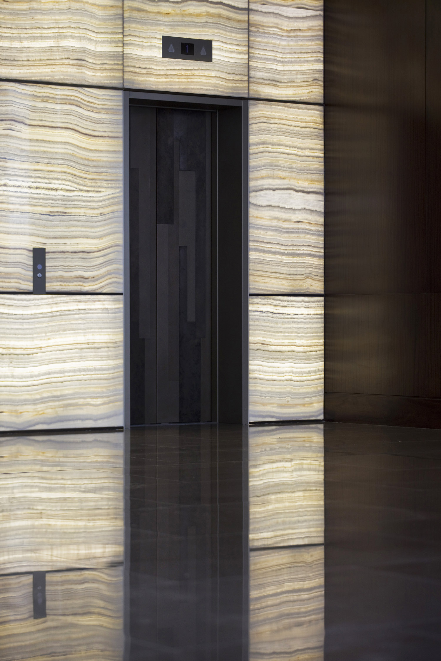 Highlights of the reception area: custom made chandeliers, polished brass screen almost an artwork, onyx lined walls, sometimes with back lighting, rock crystal lanterns and doors painted to resemble mahogany.