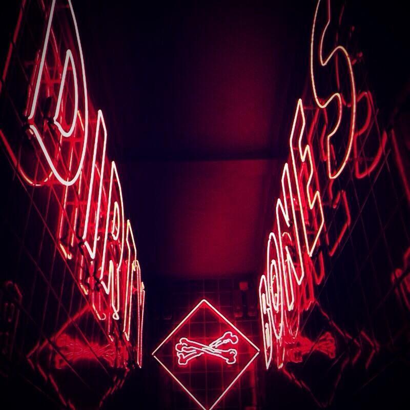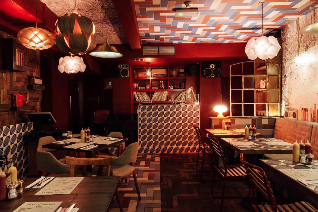 I have to admit we walked passed the entrance several times without clicking that this was our destination. The restaurant has no name-tag just a funky Dirty Bones sign, hipster! The entrance looked like a 24 hour taxi booth and a late night bar hybrid which had us pretty intrigued before we’d even set foot inside. Upon entering we were greeted and directed down a neon tile paved staircase into the den below.