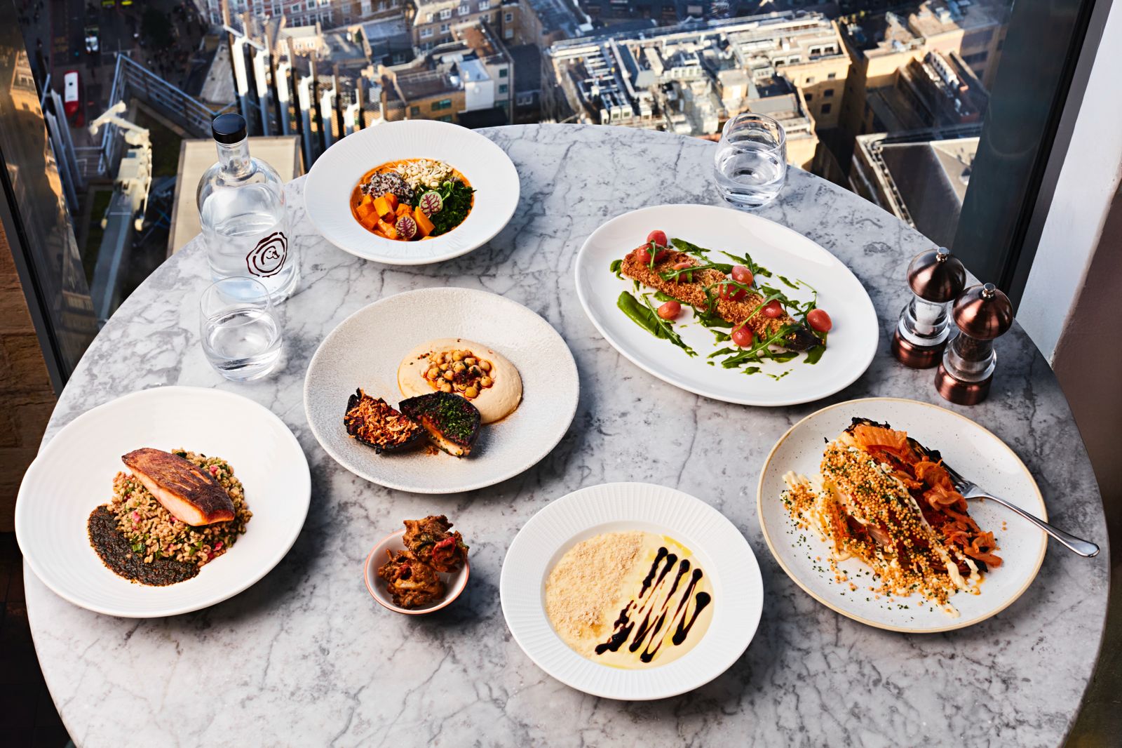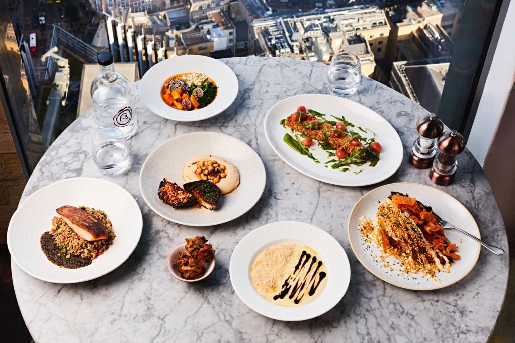 Available Monday to Friday from 11:30am to 4:30pm and priced at £36.50 per person, the menu offers a lighter take on the restaurant’s bold, comfort-led style—served high above the London skyline. Starters include a nourishing Quinoa Protein Bowl or Roasted Portobello Mushrooms, followed by mains such as Salmon Fillet with warm bulgur wheat salad or a crisp Aubergine Milanese. To finish, guests can choose from Apple & Blueberry Crumble, Caramelised Banana Bread, or a selection of ice creams and sorbets.