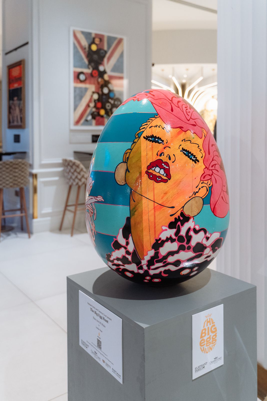 The egg, designed by celebrated artist Louise Dear, is inspired by the mantra “There Are No Rules”, a bold and joyful philosophy reflected in her signature vibrant style. Layered with radiant sunrise hues of yellow and pink, the piece captures the breathtaking Mediterranean dawns that uplift the artist. Her muse embodies pure pleasure and self-assured seduction, while pink blooms and sprawling Michaelmas daisies symbolise the changing seasons. Contrasting black and white elements ground the artwork, while two-tone blues mirror the ever-shifting waters surrounding her home. Guests can find the egg located in The Cumberland and across iconic London locations.