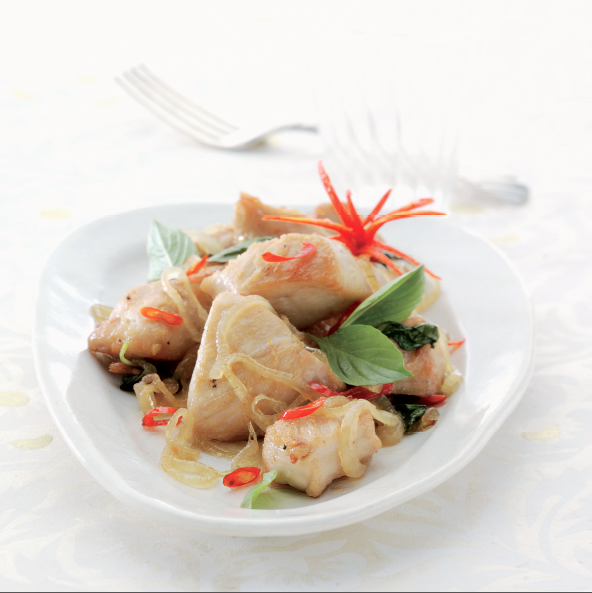 The chicken is wonderfully perfumed with fresh basil leaves, but the bird’s eye chillies add dragon-like fire. To be truly authentic, the fiendishly hot chillies should be simply crushed, but you may prefer to remove some of the seeds.