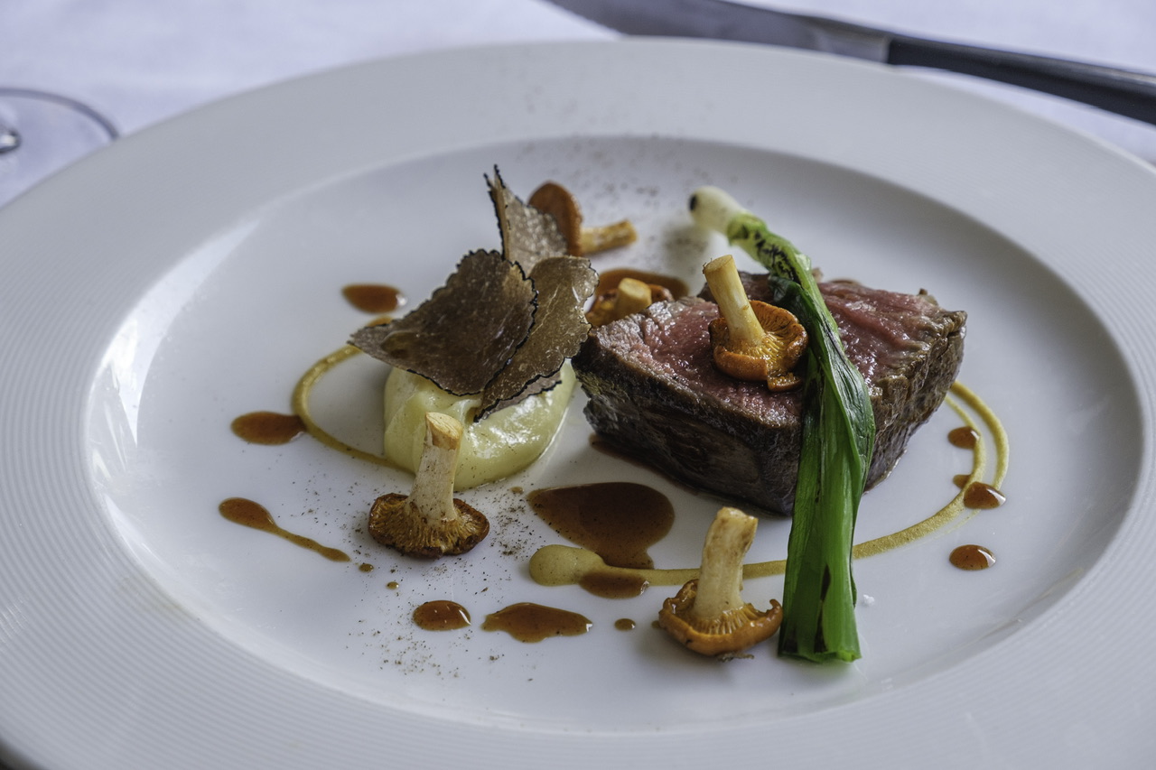 The third and fourth courses were a Fillet of seabass with Nut Tree Garden potatoes & courgettes, vermouth sauce and wild garlic oil and a Fillet of beef from Aubrey Allen – cooked medium rare pea puree, pickled trompettes, Madeira sauce and summer truffle. Both courses were perfectly cooked and melted in our mouths.