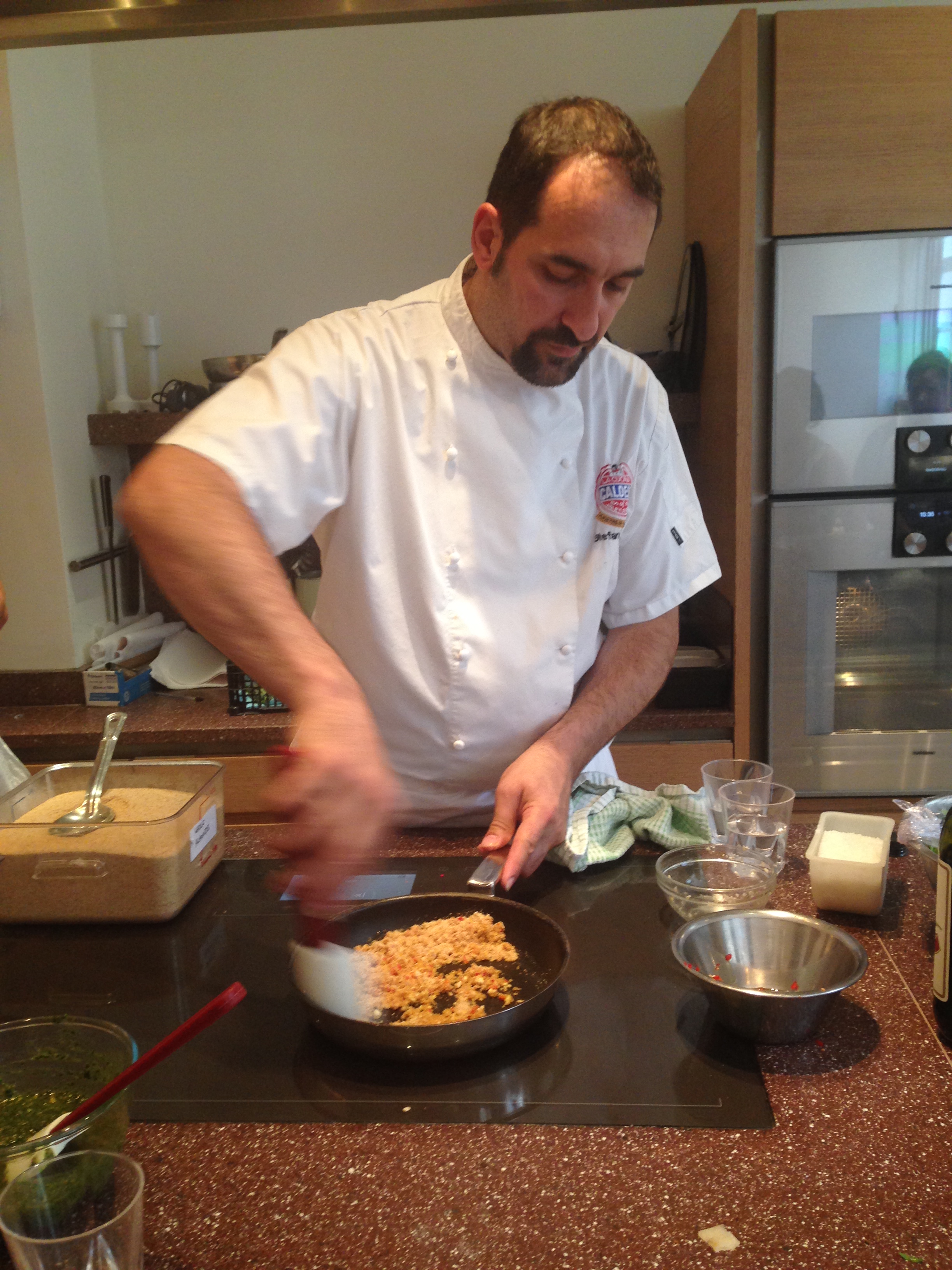 We then moved onto preparing a taster portion of roasted pepper risotto, I got the task of peeling the chargrilled peppers. We had another short break to taste the risotto and then it was all hands on deck to prepare the main coures of Steak Tagliata and fish( sea bream ) in crazy water , and dessert of a chocolate torte cake from Capri, and Almond Cantuccini and the end was in sight.