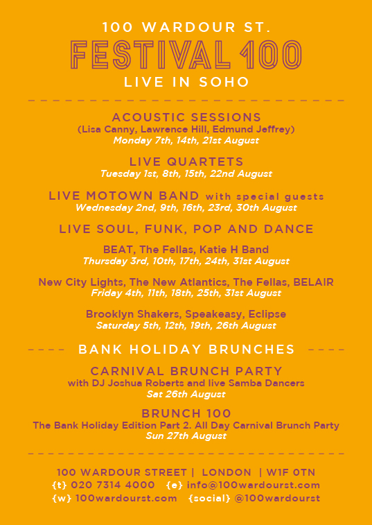 10 Wardour St is proud to present Festival 100. See below for dates, times and more information. Here at ONIN.London we love 100 Wardour St so we’ll definitely be heading along to see a couple of these events. We’ll be reviewing their Carnival Brunch Party on Sunday the 27th of August 2017 so keep an eye out on the site for that review.