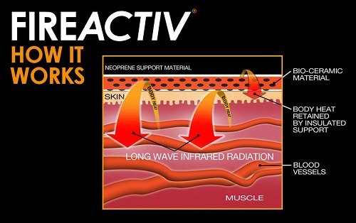 In a nutshell, FireActiv is a secure joint and muscle support which comes with deep-heat generating pads. Special bio-ceramic heat reflective particles are fused in to the fibres of the heat pads which, when placed on the skin, radiate heat back in to the body. This totally natural process is called ‘long-wave infrared radiation’ and has the effect of dilating the blood vessels which in turn increases blood and oxygen circulation in the localised area.