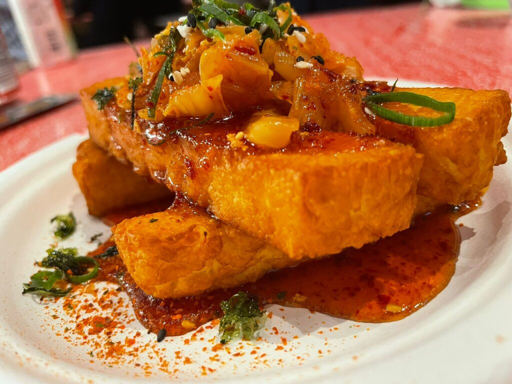 Hanbaagaasuuteeki doesn’t serve vegetarian or vegan burgers, stating that hamburgers should remain meat-based. However, one vegetarian guest enjoyed the Kimchi Loaded Fries, Honey Gochujang Sticks, and Padron Peppers. We missed out on the kimchi fries ourselves, but others around us praised them. The Halloumi Fries were a hit — thick-cut and served with a sweet-spicy glaze.