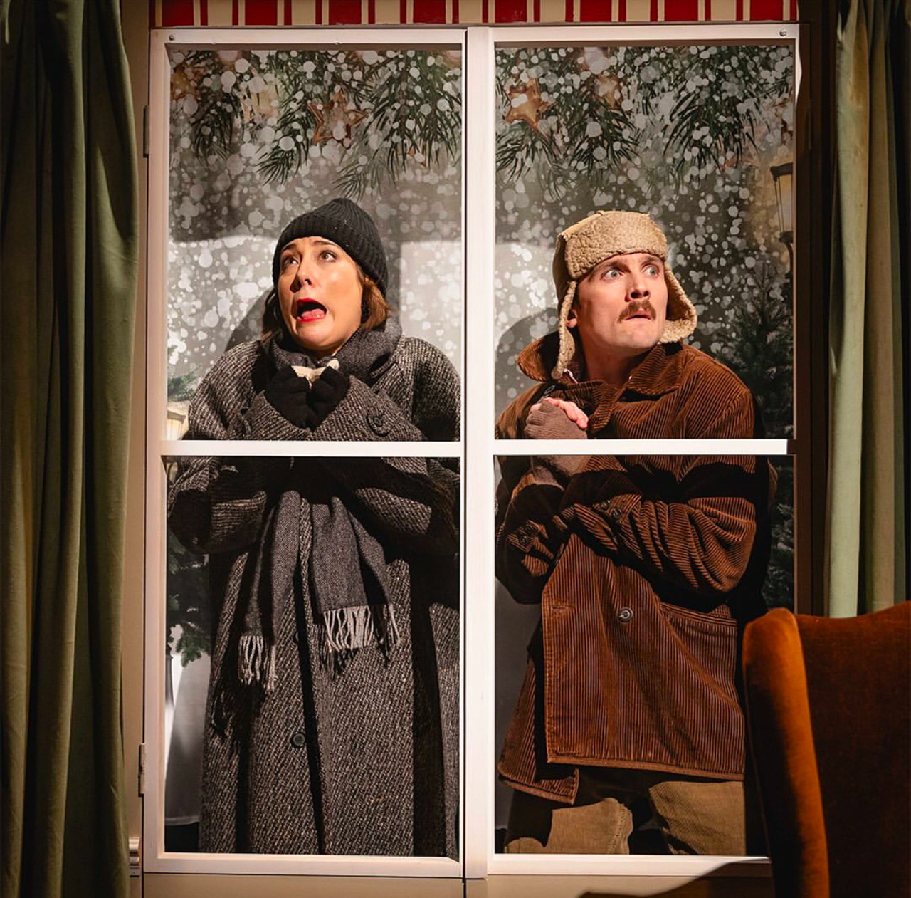 Louie Whitemore’s set design is a living room decorated for Christmas complete with family portraits, which open for faces to pop through and sing. A memorable moment is Chris McDonell’s lighting when the thieves are watching all the timers go on in the prop houses. The famous booby-trap scene is recreated superbly. Though the Studio space is a small stage but director Alex Jackson makes full use of it- ensuring the cast comes out to the audience and even uses the balcony level for Kevin’s escape scene. It took me a few minutes to get into the performance but when I did the two hours (with a shirt intermission) flew by.