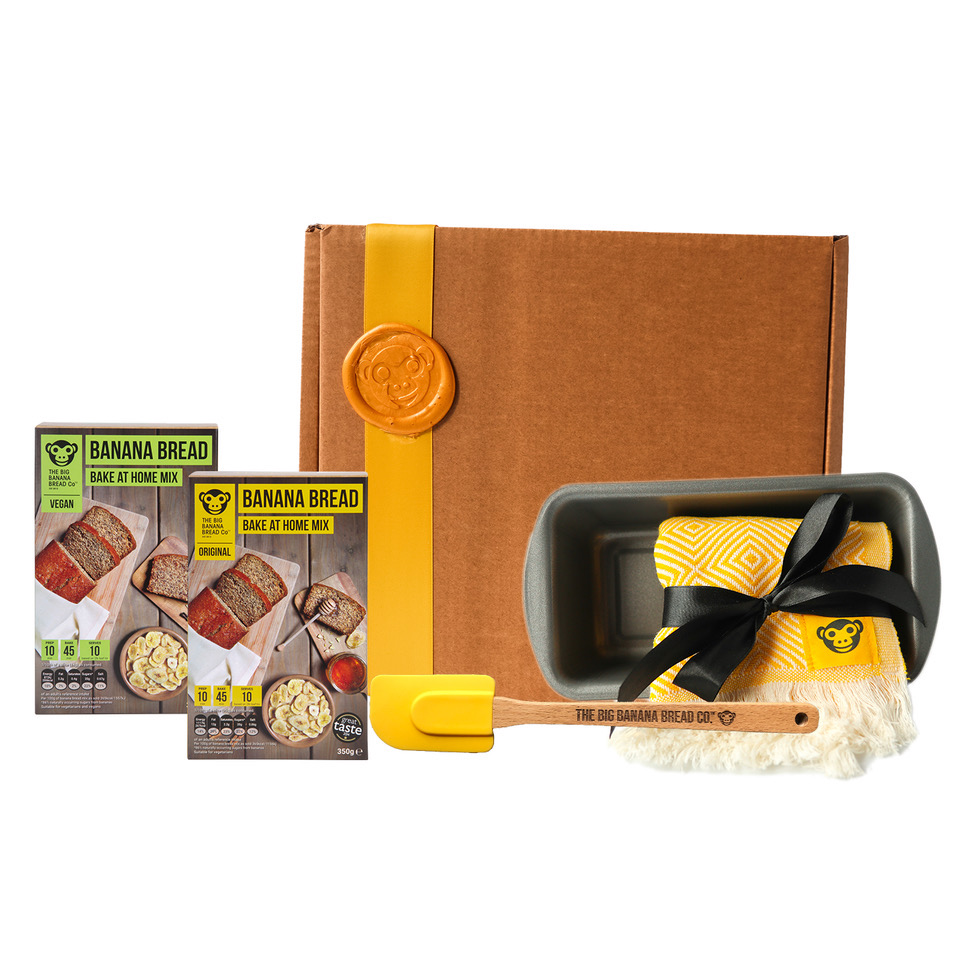 Beautifully packaged in 100% recyclable double walled cardboard gift box, presented with a yellow ribbon and Big Banana Bread wax seal think of the Big Bananza Box. Costing £27.95 the BIG Bananza Box includes: