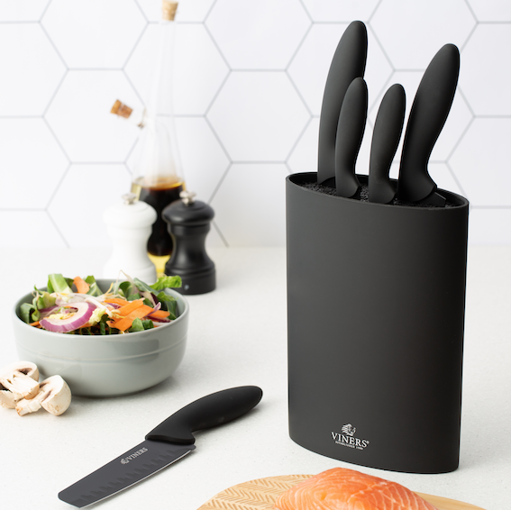 Assure Knife Block The Assure Knife Block offers five knives, all with a modern design, and innovative square shaped blade that eliminates the tip of the knife to make it safer to use without compromising on performance. Delivering the same functionality of a standard knife set, you get a Chef’s Knife, Carving Knife, Santoku Knife, Utility Knife and Paring Knife. Each knife is made of high quality stainless steel and features soft touch handles for comfort and support. The knives also come with a 10 year guarantee. RRP £38.