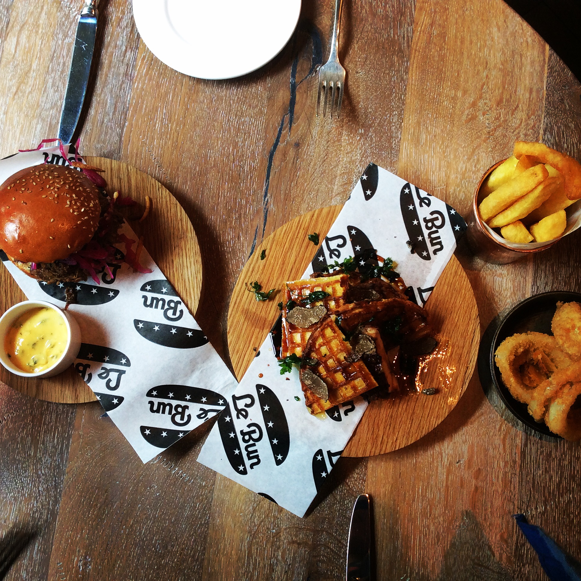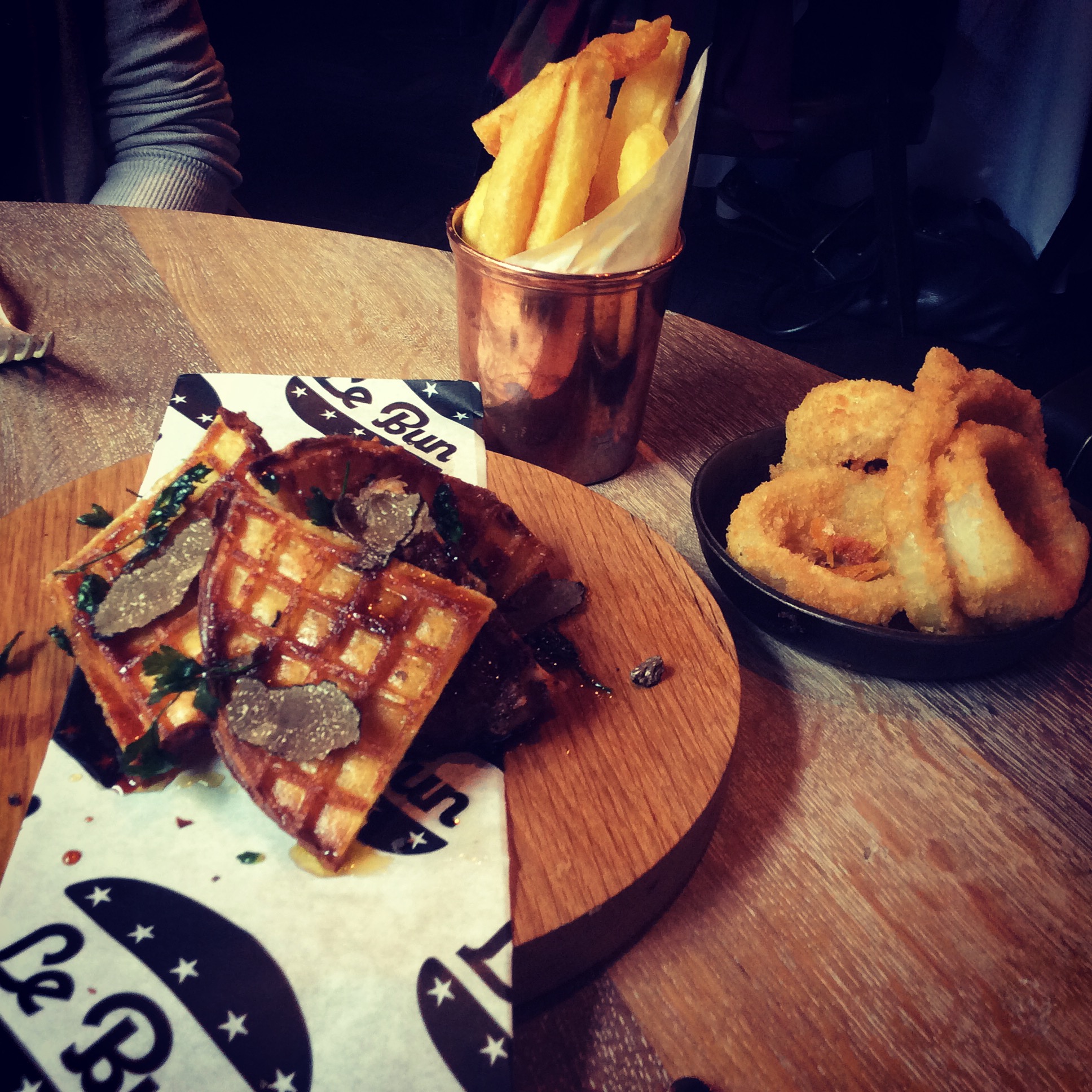 We opted for buttermilk chicken waffles and pulled confit duck brioche. We teamed these little beauties with chucky chips and onion rings, you know those standard brunching necessities!