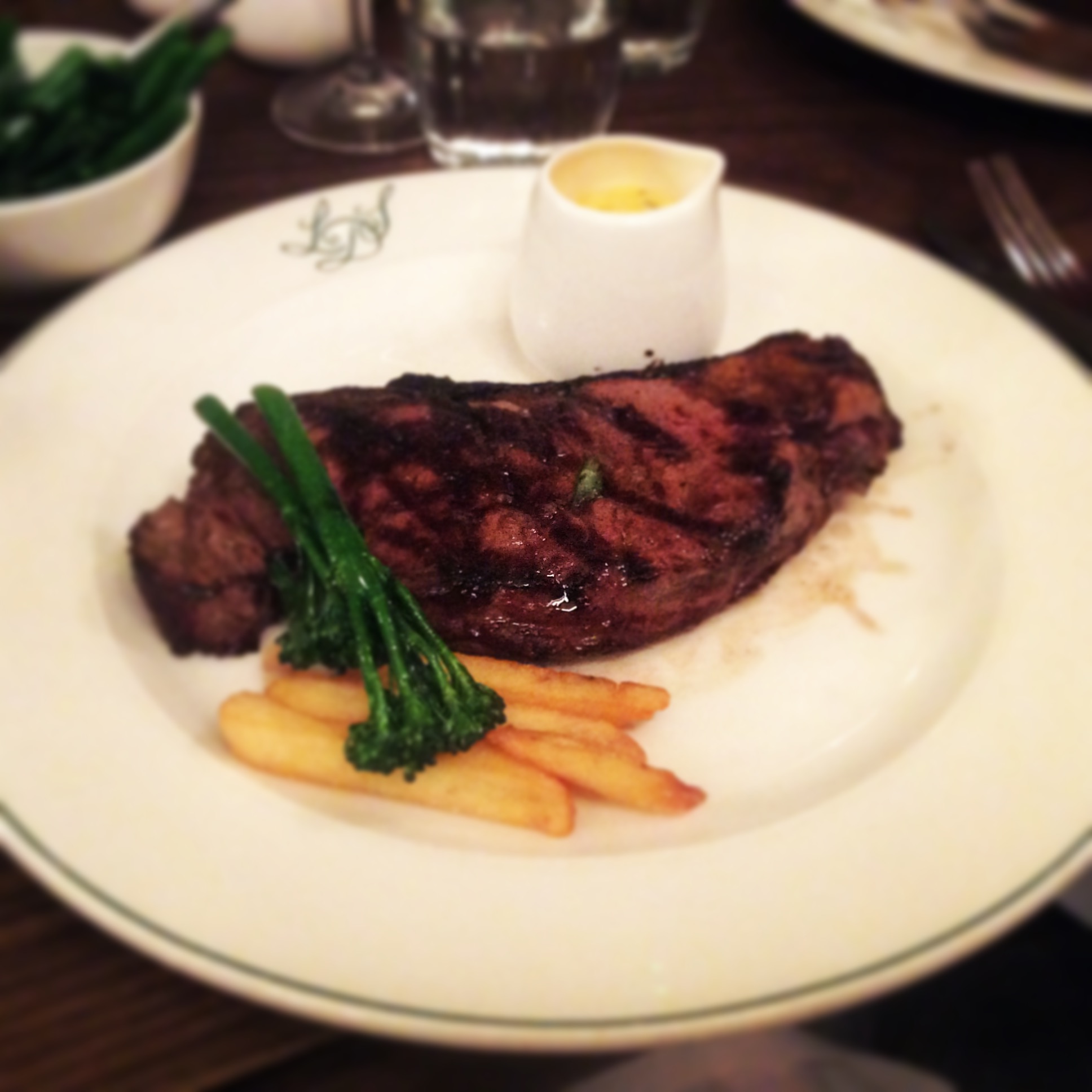 Upon entering out coats were hung and we were shown to our table and allowed to browse the menu. The choice of steaks really caught our eye with several cuts we’d never heard of before including the USDA flank steak and the NY strip. Upon recommendation of our waiter Mercko we opted for the latter, and teamed it with some of their chips, tender stem broccoli and rocket & Parmesan salad (you know when your really in the mood for steak and chips!)