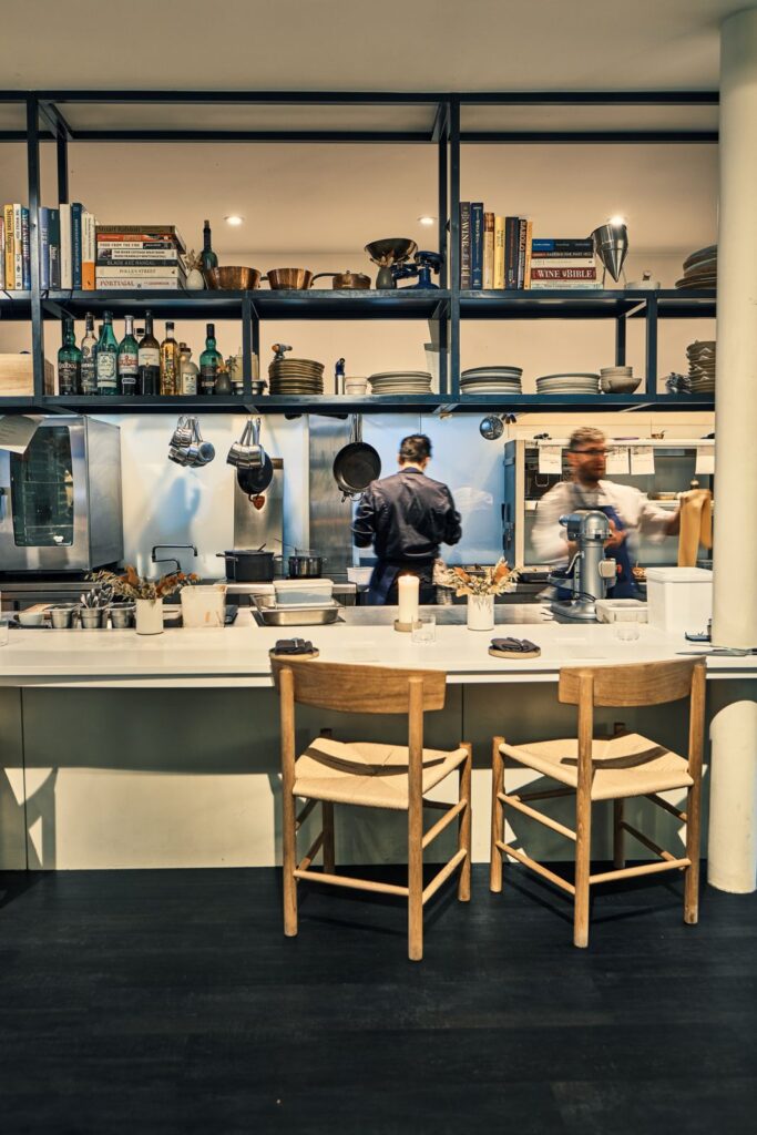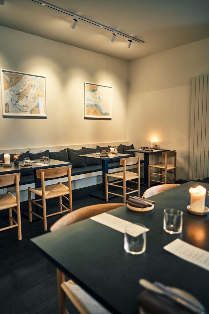 Chef Roberta Hall-McCarron and her husband Shaun opened the restaurant in 2018, later moving it to a slightly larger space in 2021. The interior is understated, calming in theme, and effortlessly elegant-wooden floors, navy and white tones, and nautical maps on the walls offer subtle nods to Scotland’s seafaring heritage. The open kitchen, visible from much of the dining room, sets the tone: warm, precise and quietly confident.