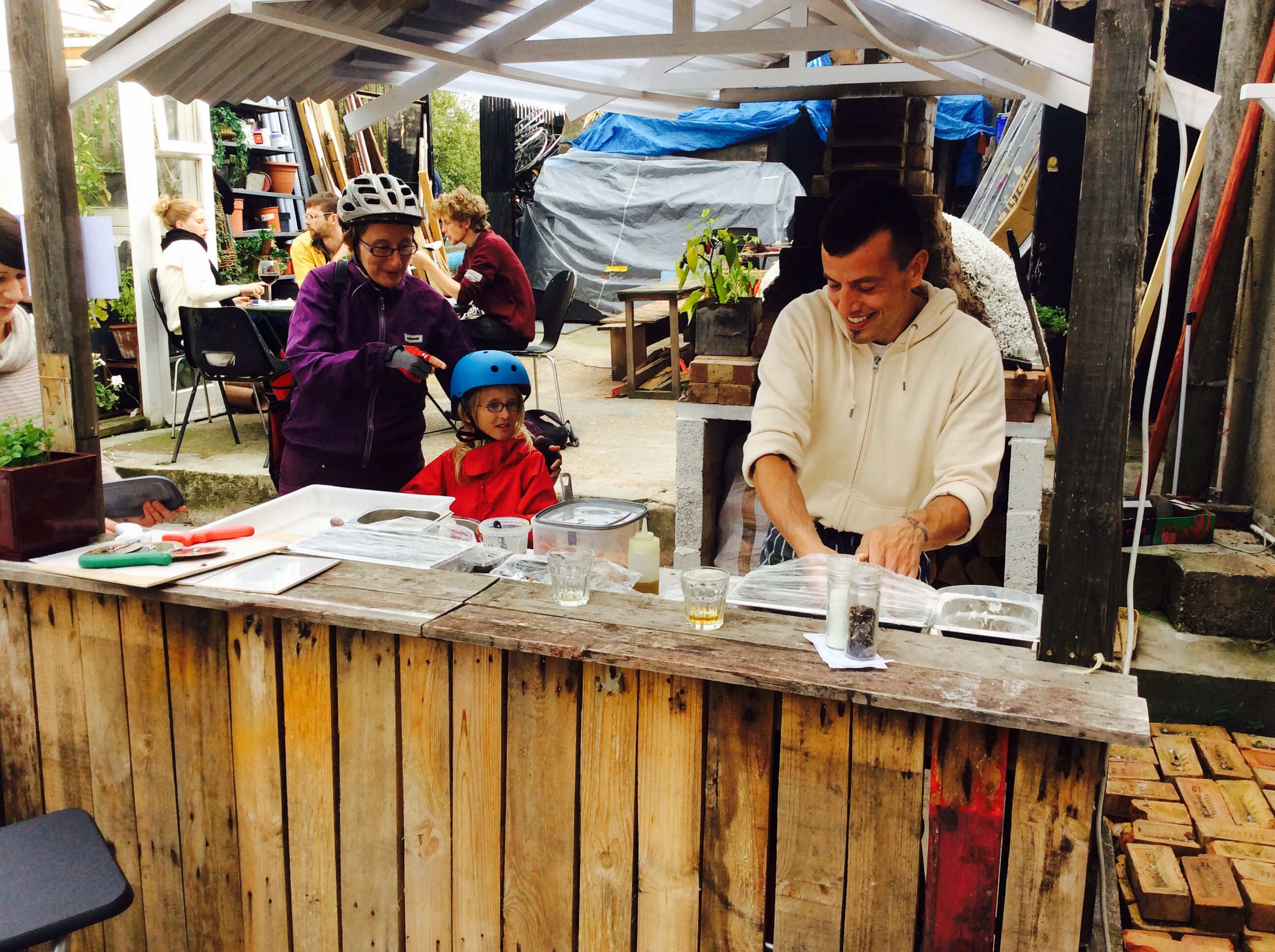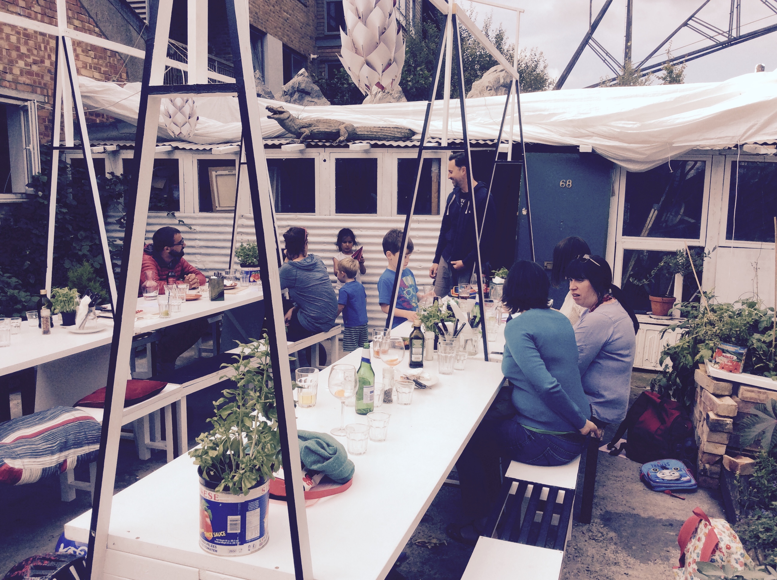 Beautifully situated on the rivers edge, founders Kate and Fabrizio have erected a roofed terrace in their garden, beautifully decorated with Italian goodies and quirky art. Quirky is the name of the game, just up from the rive you enter the yard up some little black steps just situated between 2 timber cranes?