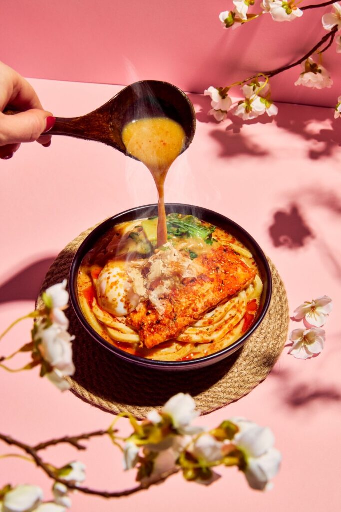 The Sakura Miso Udon range  is a tribute to the  timeless ritual of Cherry Blossom season, weaving the essence of Hanami into every bite. The comforting miso broth, rich with umami and a hint of shichimi spice, mirrors the warmth and vitality of springtime gatherings. The marinated salmon and tofu, tender and flavourful, symbolizes the abundance of the season, whilst the fresh bok choy adds a touch of green, reminiscent of new life sprouting under the blossoms. The silky onsen egg evokes the gentle balance of nature and the classic garnishes—bonito flakes swaying like petals in the breeze—complete the experience.