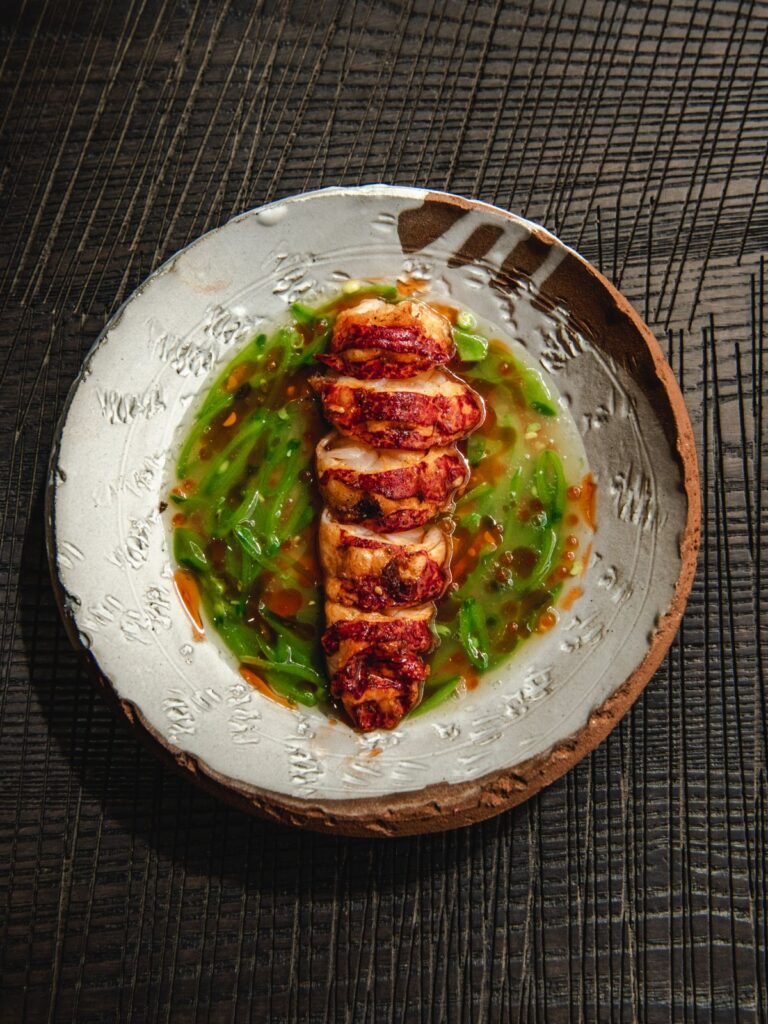 The menu is the work of executive chef Andy Cook, alongside head chef Nick Tannett. Cook spent five years in Japan and a decade working with Gordon Ramsay, while Tannett comes from some of London’s most respected kitchens. Their combined skill shows in a menu that looks familiar but tastes completely fresh. It’s Japanese in spirit but deeply rooted in British ingredients, with plenty cooked over fire. The duck dumplings with Tokyo turnips and wasabi duck fat were rich, delicate and perfectly balanced. A Tamworth pork chop with roasted peach and karashi mustard felt indulgent but lightened by that sweet-sharp contrast. The Cornish lobster with peas and clam broth was as good a seafood dish as I’ve eaten in London, delicate yet full of depth.