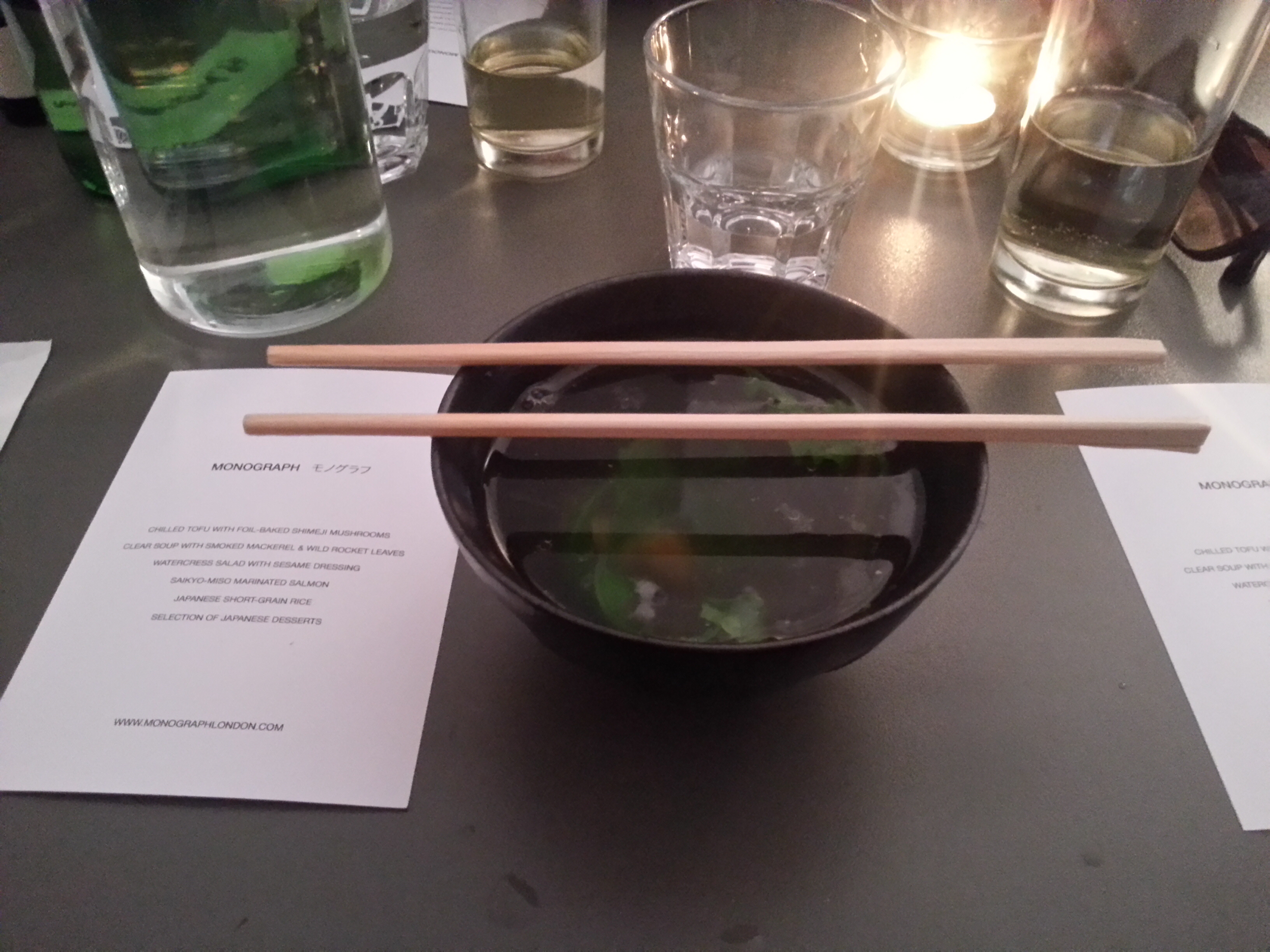 Frankly, given the quality of the food, I think more Italians out to try it and perhaps put down their basil and passata. Starting with some pickles and cucumber just to whet our palates, before proceeding on to a beautiful, simple clear soup of smoked mackerel and wild rocket the tone was one of delicacy and careful thought. The main event was perfectly cooked marinated salmon served simply with Japanese rice and soya sauce served in a small spray bottle to minimise waste and to avoid drowning the food. A very neat touch and one that, as the chef himself said, derives from his almost obsessive attention to detail.