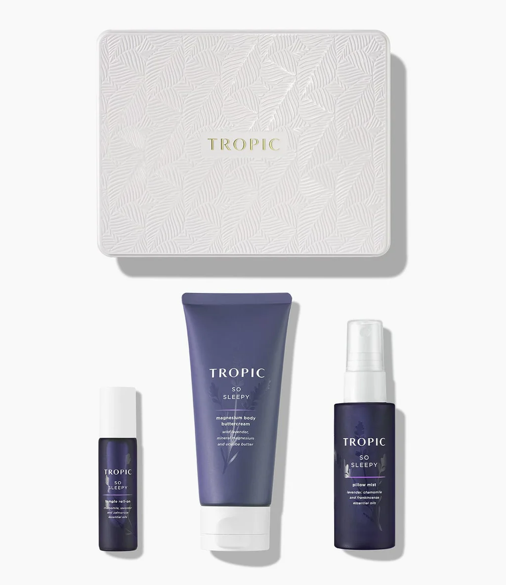 A thoughtfully crafted gift set of three sleep-promoting products, including a body buttercream, pillow mist and pulse point oil. Infused with a proprietary blend of seven premium distilled essential oils – including wild lavender, chamomile and frankincense – the soothing formulas are clinically tested and shown to improve sleep quality by 33%