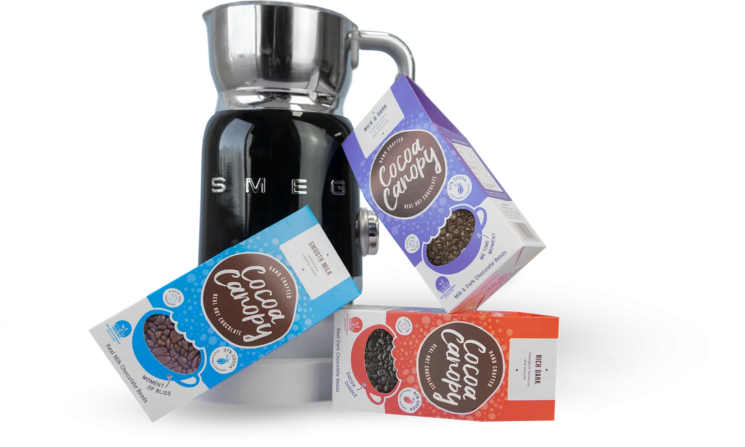 If you really want to wow someone with a hot chocolate lovers gift, Cocoa Canopy‘s Kick Off Bundle offers you the ultimate hot chocolate set up – a choice of one pack of drinking chocolate beads, and a Dualit Milk Frother (available from their online shop, RRP £50) or soil her even more with the £150 kit which includes the Smeg Frother.