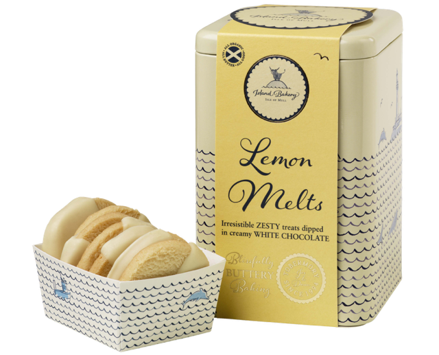 Lovingly crafted on the Isle of Mull, these goodies are baked with 100% organic ingredients, and delivered in a beautifully designed tin featuring a lively Hebridean seascape. The award-winning Lemon Melts are irresistible zingy lemon biscuits dipped in a layer of rich white chocolate. The tin contains 2 x 90g packs of Lemon Melts.