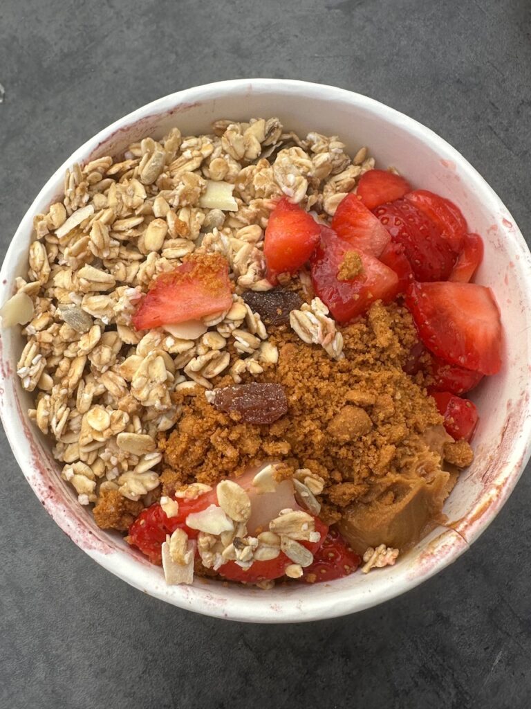 Continuing on, for a late afternoon snack, I chose a ‘build your own’ acai bowl at Wembley Park’s Black Sheep Coffee. There are several toppings to choose from including granola, banana, blueberries, jam, coconut shavings, cocoa nibs. After staring at the screen for some time not knowing what I wanted, I opted for strawberries, Nutella and cocoa nibs only to be informed there wasn’t enough cocoa nibs. The staff suggested I add peanut butter and biscoff crumbs, and this was spot-on. Each spoonful delivered layered textures and satisfying flavour.