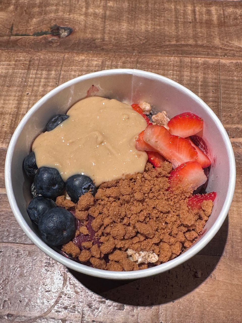 In addition, I also had a ‘build your own’ acai bowl. I chose blueberries, strawberries, peanut butter and biscoff crumbs. The result was a refreshing blend of antioxidant-rich, organic, frozen Açaí topped with crunchy honey nut granola with fresh fruit. It was perfect for the 20+ weather we’ve been having lately, and a great light bite.